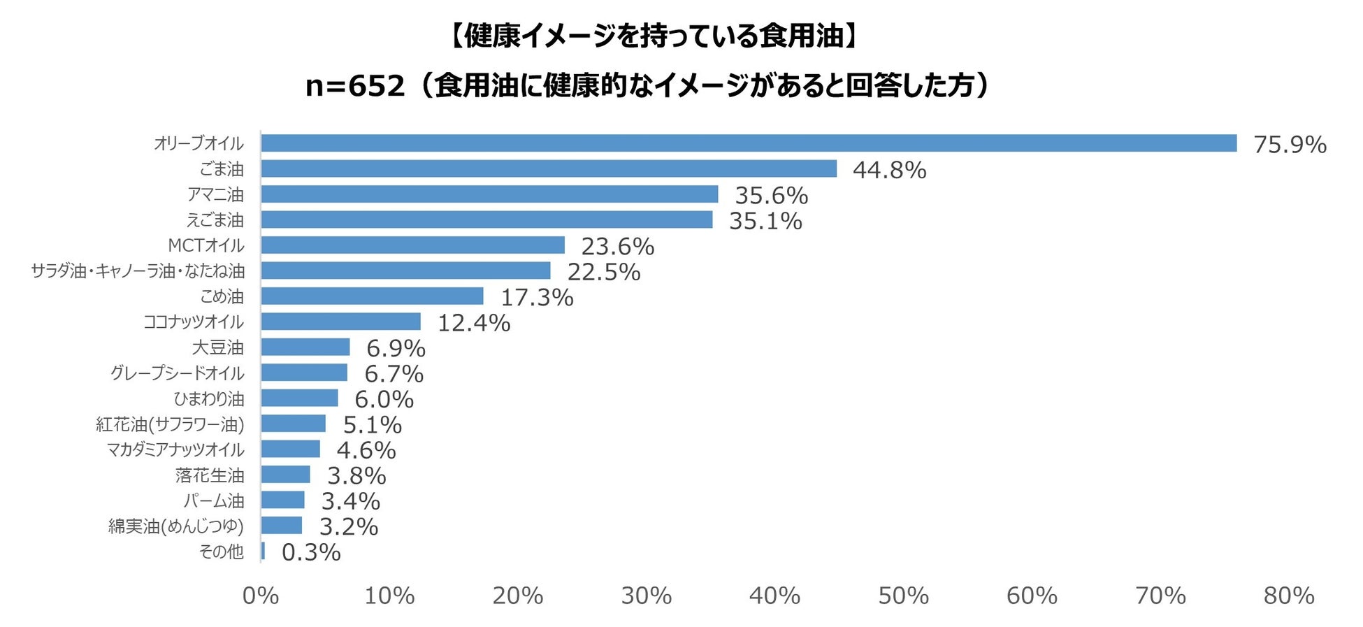 続いて、先ほどの「食用油(オイル)に健康のイメージがある」と回答した、652名に対し、「健康に良い」イメージのある食用油(オイル)について聞いてみたところ、1位は「オリーブオイル(75.9%)」、2位「ごま油(44.8%)」、3位「アマニ油(35.6%)」、4位「えごま油(35.1%)」、5位に「MCTオイル(23.6%)」が続きました。この結果からも比較的近年、注目度の高い機能性を持ったオイルが上位に上がり、オイルへの健康イメージを押し上げている要因の一つではないかという示唆が窺えます。