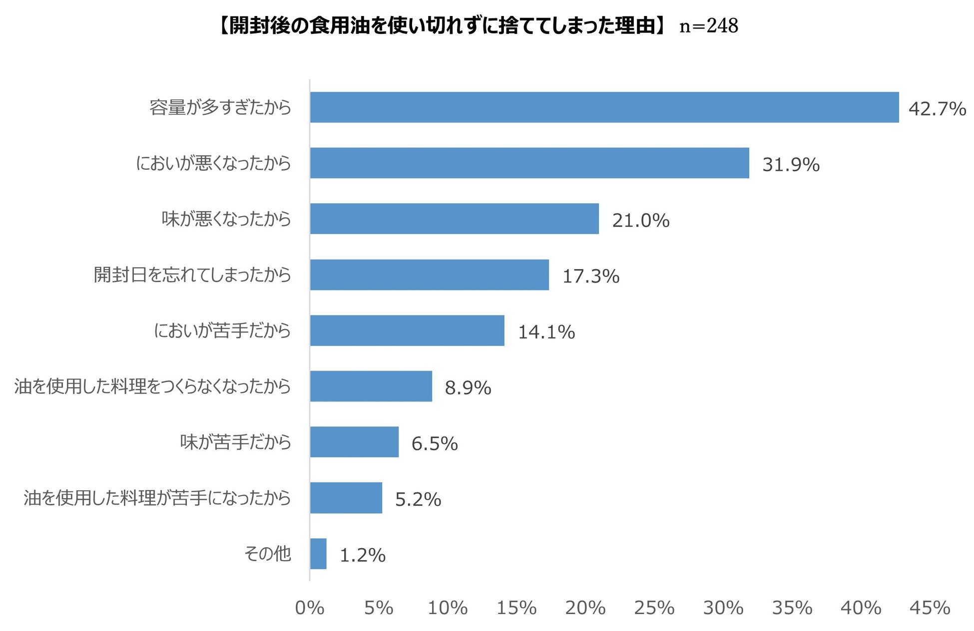最後に、ご自宅にある開封後の食用油(オイル)を使い切れず捨ててしまった経験はあるか聞いたところ、4人に1人(24.8%)が「経験がある」と回答。また、「経験がある」と回答した248名に対し、「使い切れず捨ててしまった理由」についても聞いたところ、「容量が多すぎた(42.7%)」、「においが悪くなった(31.9%)」、「味が悪くなった(21.0%)」が上位に上がる結果となりました。この結果からも、使い切れず捨ててしまうという判断に至る理由として、酸化している油の特徴でもある、においや味の変化を少なからず感じている方もいるのではないでしょうか。