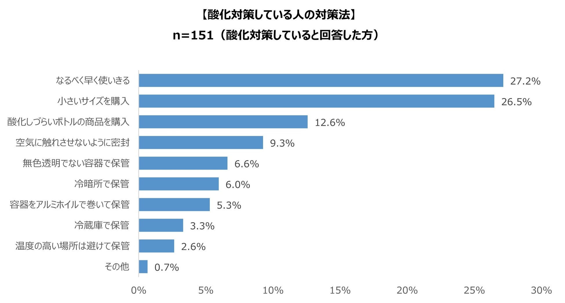 酸化対策している人の対策法「なるべく早く使いきる」「小さいサイズを購入」が上位に