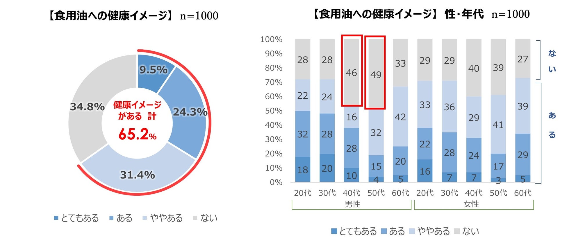 また、性・年代別で見ると、40~50代では男女ともに低い傾向にあり、男性40~50代では約半数(40代:46%/50代:49%)が食用油(オイル)に「健康のイメージはない」と回答し、他の世代に比べて大きなイメージの差があることも明らかになりました。