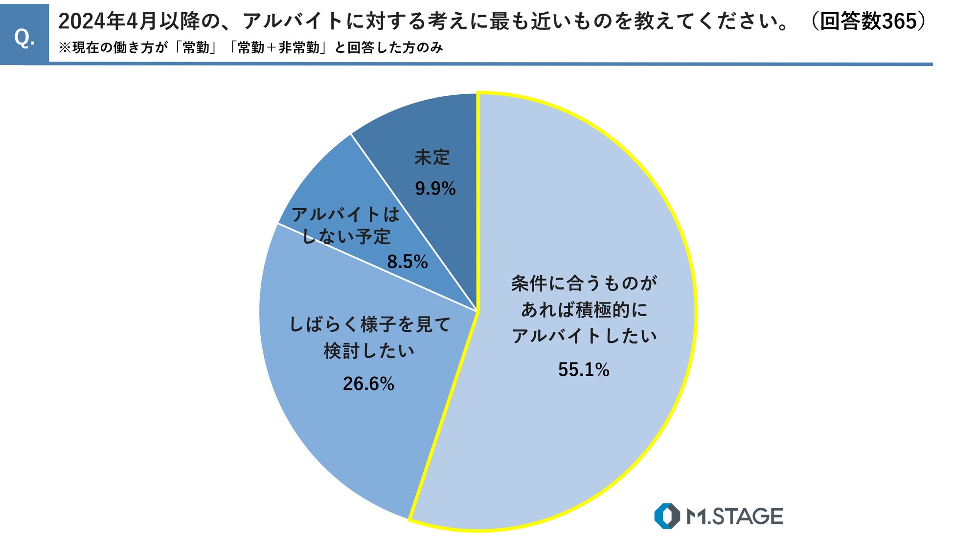 このアルバイトについて、現在「常勤+非常勤」「常勤のみ」で働く医師の今後の意向は「条件が合うものがあれば積極的にアルバイトしたい」(55.1%)という回答が最も多い結果となり、半数以上の医師がアルバイトを積極的に検討していることがわかりました。