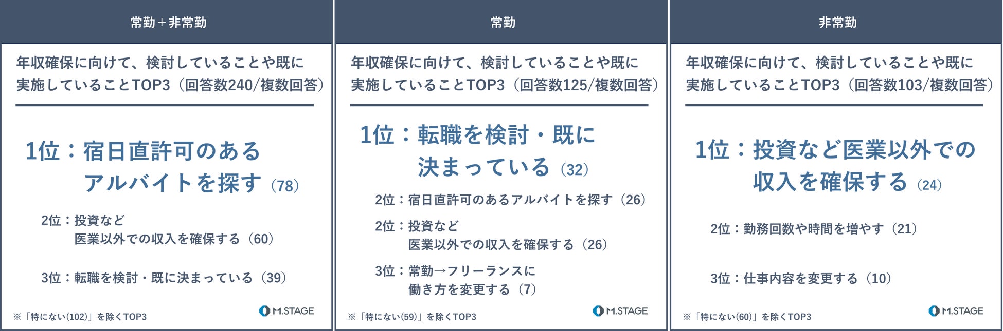 年収確保に向けて検討していることや既に実施していることについて、「常勤+非常勤」の医師は「宿日直許可のあるアルバイトを探す」(78)、「常勤」の医師は「転職(入社先が既に決まっている)・転職活動を進めている・転職を検討している」(32)、「非常勤」の医師は「投資など医業以外での収入を確保する」(24)が最も多い結果となりました。また、全ての働き方で「投資など医業以外での収入を確保する」がトップ3にランクインする結果となりました。