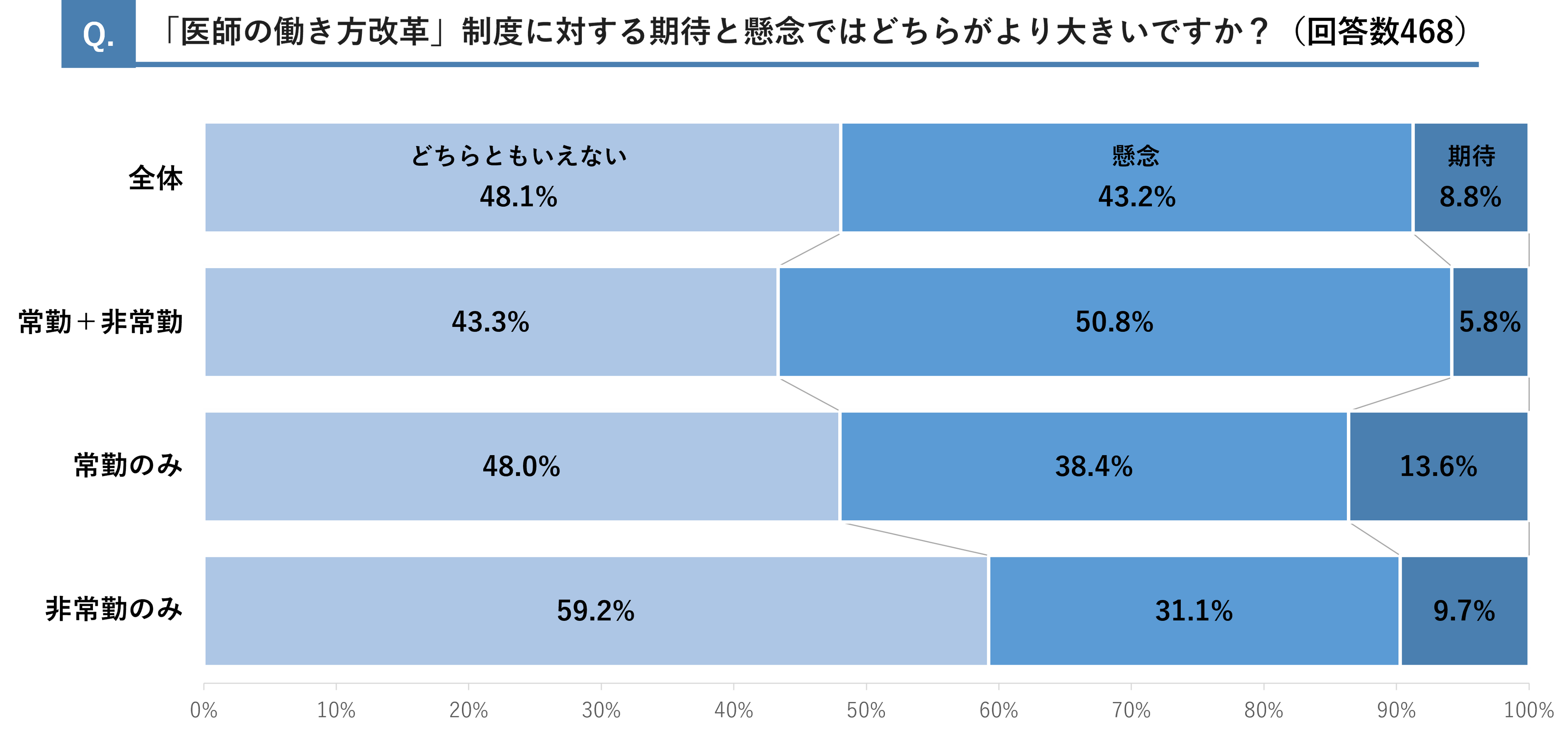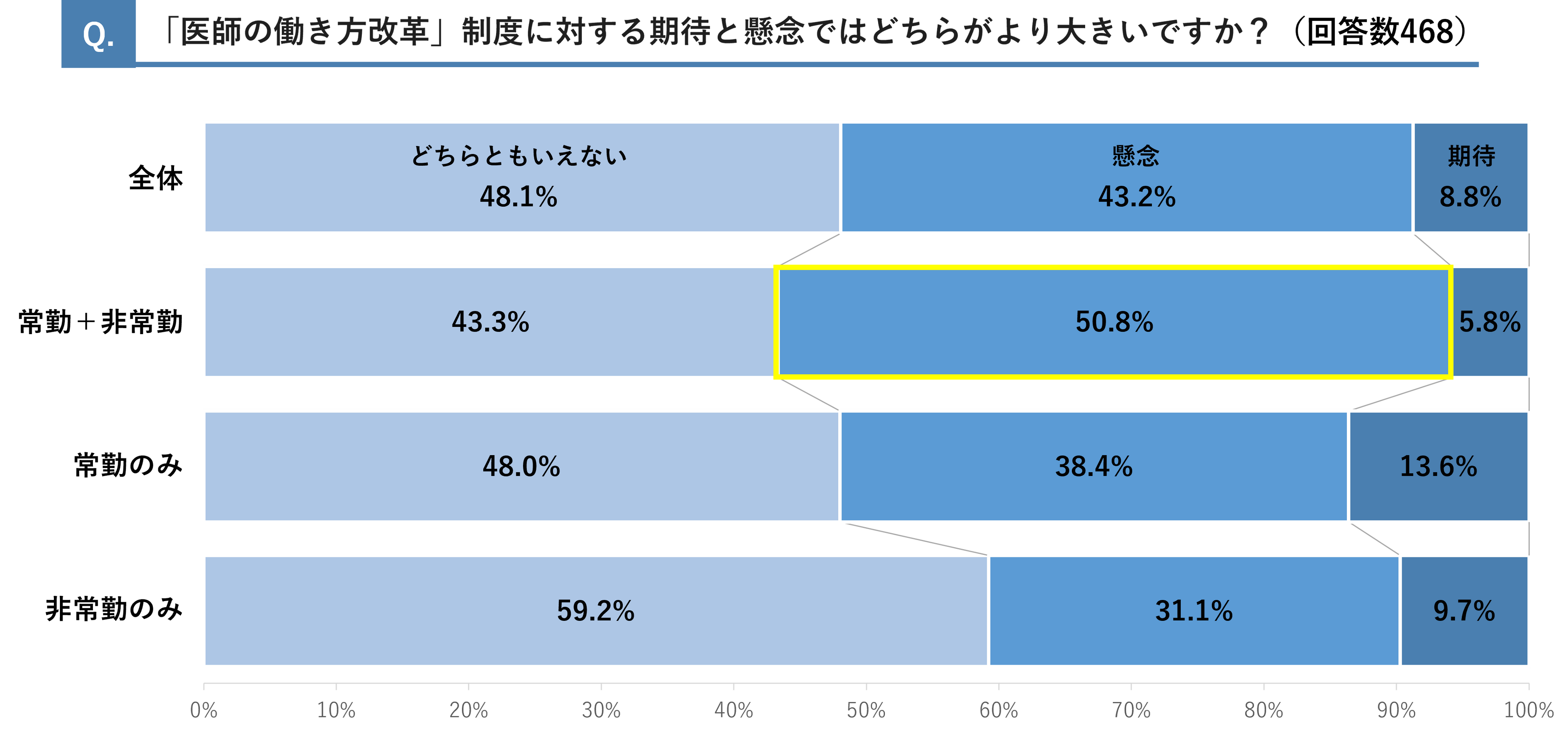 「医師の働き方改革」に対する期待と懸念について、「どちらともいえない」と回答した医師は48.1%「懸念の方が大きい」と回答した医師は43.2%、「期待の方が大きい」と回答した医師は8.8%という結果になりました。また、働き方別でみると「常勤のみ」「非常勤のみ」の医師は「どちらともいえない」という回答が最も多いなかで「常勤+非常勤」の医師は「懸念の方が大きい」が50.8%となり「どちらともいえない」を上回る結果となりました。