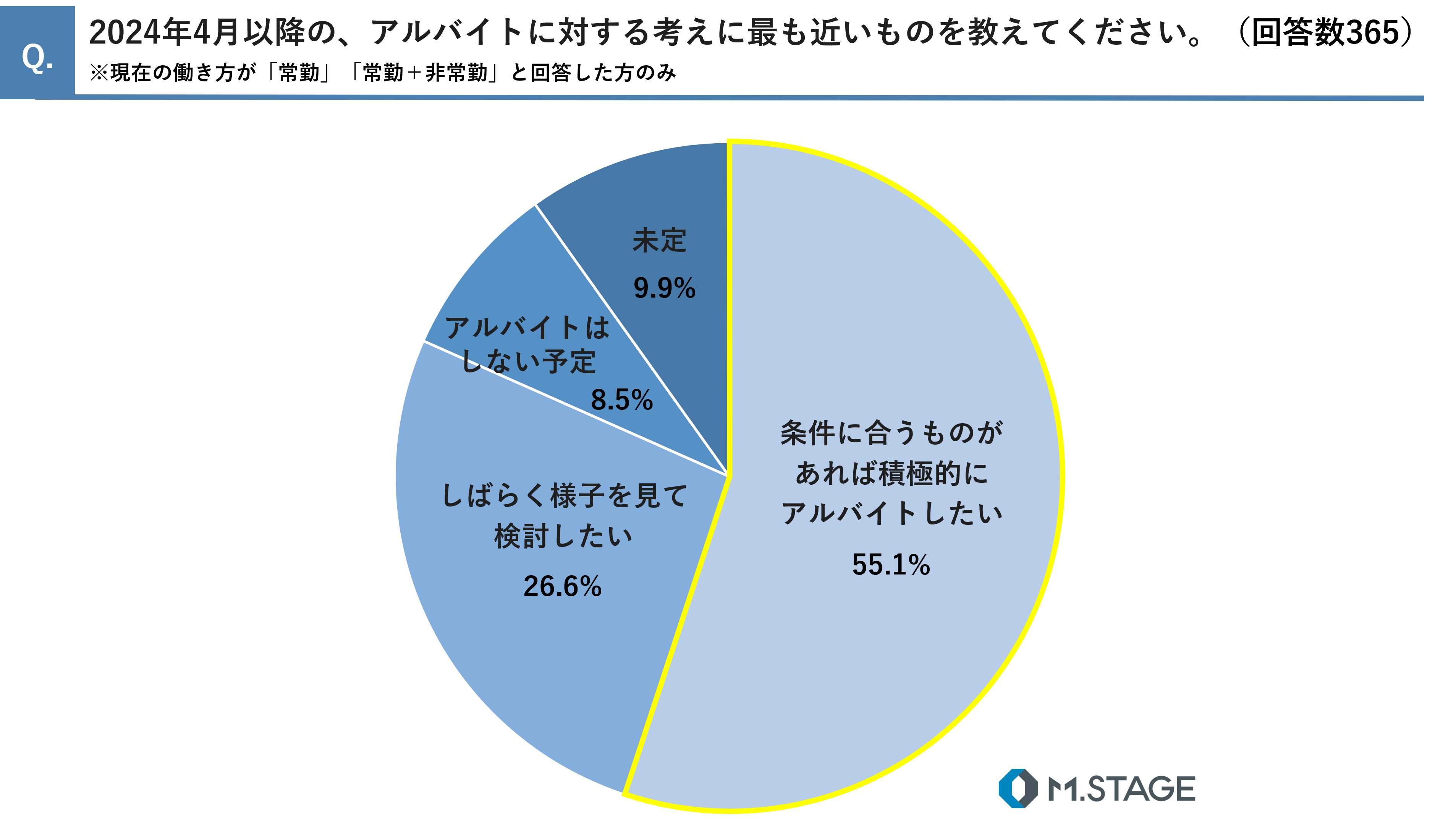 このアルバイトについて、現在「常勤+非常勤」「常勤のみ」で働く医師の今後の意向は「条件が合うものがあれば積極的にアルバイトしたい」(55.1%)という回答が最も多い結果となり、半数以上の医師がアルバイトを積極的に検討していることがわかりました。