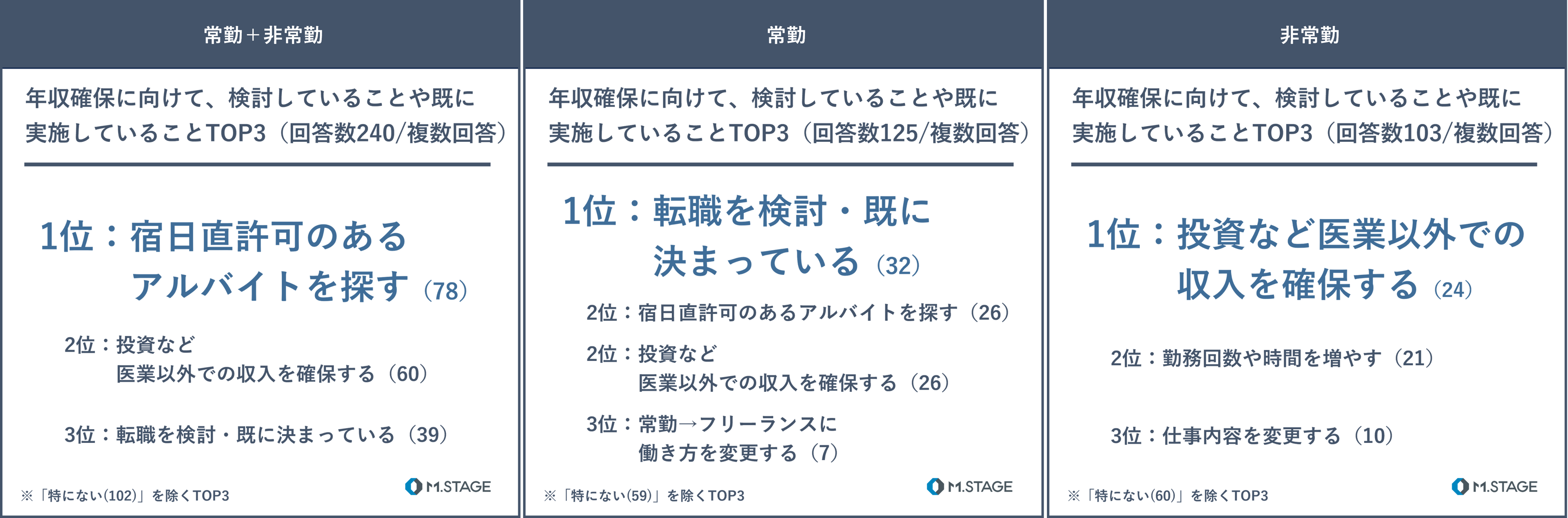 年収確保に向けて検討していることや既に実施していることについて、「常勤+非常勤」の医師は「宿日直許可のあるアルバイトを探す」(78)、「常勤」の医師は「転職(入社先が既に決まっている)・転職活動を進めている・転職を検討している」(32)、「非常勤」の医師は「投資など医業以外での収入を確保する」(24)が最も多い結果となりました。また、全ての働き方で「投資など医業以外での収入を確保する」がトップ3にランクインする結果となりました。