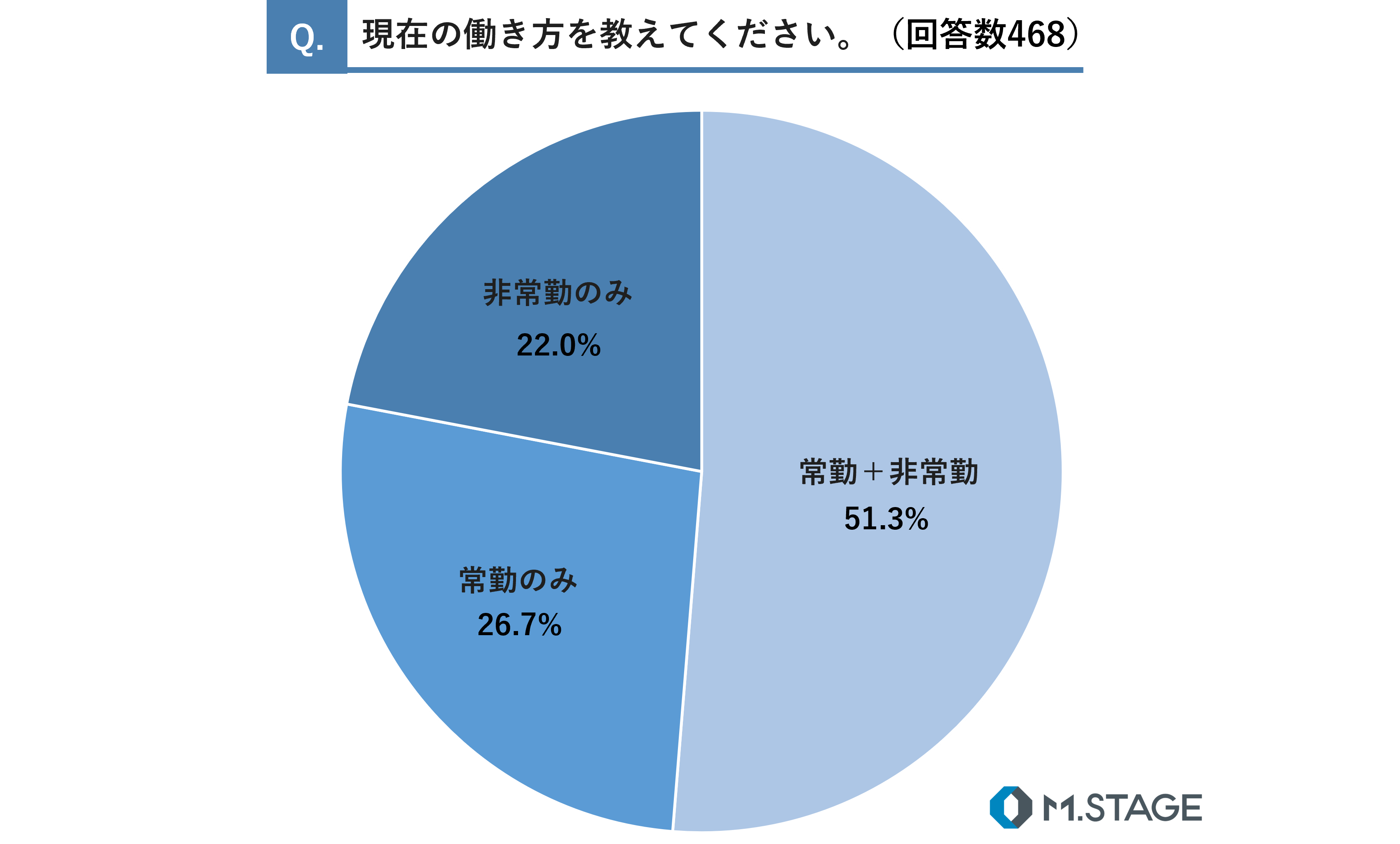 この3つの働き方のなかで、現在、最も多い医師の働き方が「常勤+非常勤」で、半数以上(51.3%)の医師がこの働き方をしています。次いで多いのが「常勤のみ」で26.7%となり、「非常勤のみ」の医師は22.0%という結果となりました。