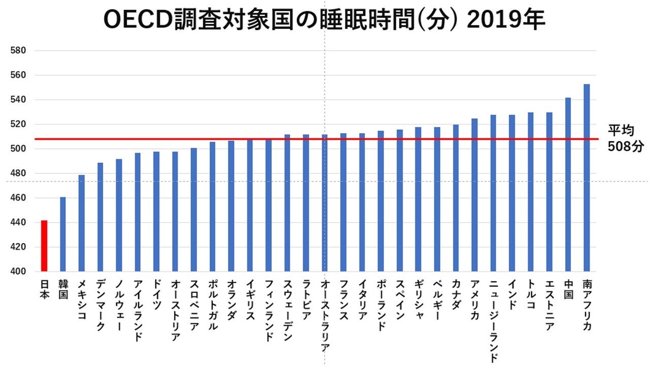 2019年の調査で日本人の平均睡眠時間は7時間22分とOECD33ヵ国で一番短かったです。世界平均は8時間28分であり、1時間以上も睡眠が不足しています。そして睡眠不足による日本の経済損出は15兆円という膨大な金額におよぶと試算されています。