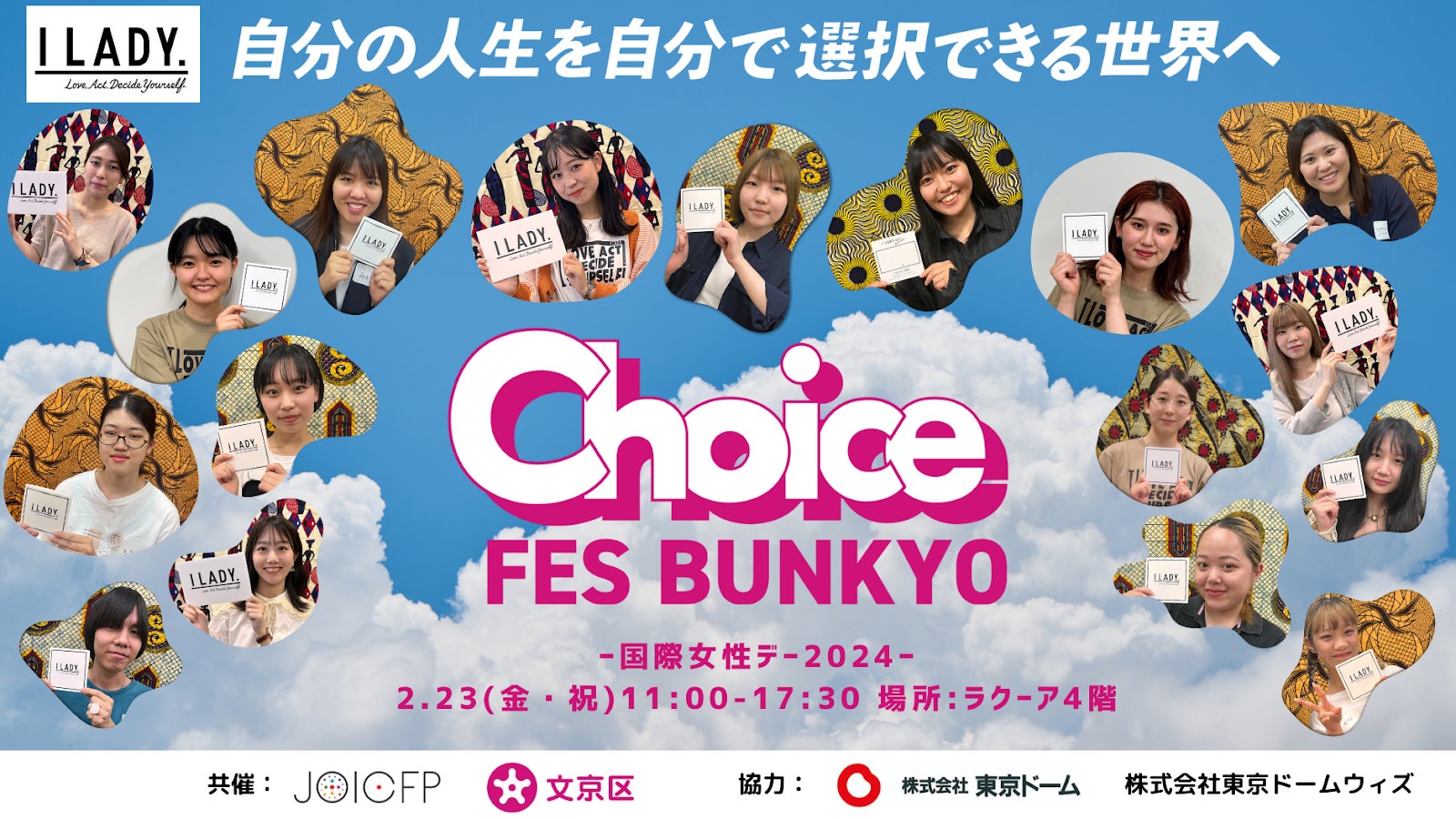 国際協力NGOジョイセフ(東京都新宿区)は、3月8日の国際女性デーに先駆けて、日本の主に10~20代を対象にイベント「CHOICE FES BUNKYO」(東京ドームシティ ラクーア4階)を開催します。セクシュアル・リプロダクティブ・ヘルス/ライツ(性と生殖に関する健康と権利:以下SRHR)に関する情報提供を行い、アクションのきっかけをつくる「 I LADY. 」プロジェクト の一環で、文京区を拠点に活動するI LADY.ピア・アクティビストが、自分らしい生き方のヒントをお届けします。ラクーアでのショッピングついでに、ライフスキルとしての身近なSRHRの情報を得て、より自分らしい生き方をデザインしてみませんか?