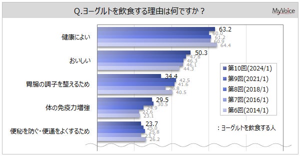 ヨーグルトを飲食する理由は(複数回答)、「健康によい」が飲食者の63.2%、「おいしい」が50.3%、「胃腸の調子を整えるため」が34.4%、「体の免疫力増強」「便秘を防ぐ・便通をよくするため」が各20%台です。