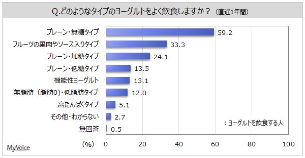 ヨーグルト飲食者がよく飲食するタイプは(複数回答)、「プレーン・無糖タイプ」が59.2%、「フルーツの果肉やソース入りタイプ」が33.3%、「プレーン・加糖タイプ」が24.1%です。