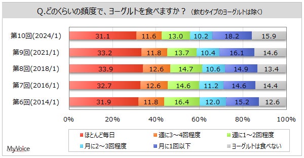 <今 回>(2024/1)https://myel.myvoice.jp/products/detail.php?product_id=30602 上記設問の他に、「ヨーグルトを食べる場面」「ヨーグルトの好きな銘柄」も聞いています。 <第9回>(2021/1)https://myel.myvoice.jp/products/detail.php?product_id=27002 <第8回>(2018/1)https://myel.myvoice.jp/products/detail.php?product_id=23403 |