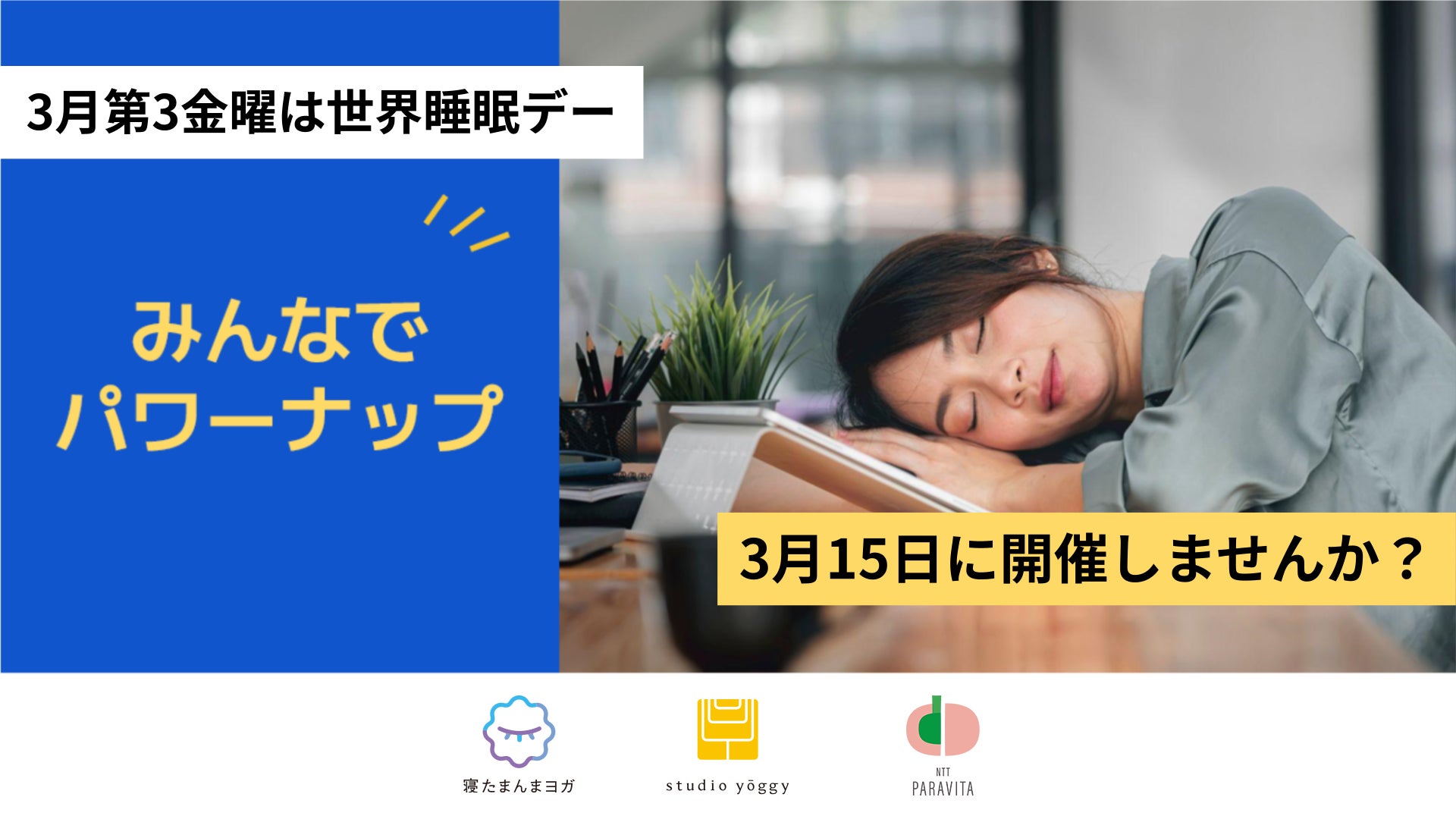 ねむりのDXカンパニーNo.1をめざすNTT PARAVITA株式会社(大阪市 代表取締役社長:中野 康司、以下「NTT PARAVITA」)は、アプリ「寝たまんまヨガ」を開発・販売、ヨガスタジオ「スタジオ・ヨギー」を全国14拠点に展開する株式会社ヨギー(東京都目黒区 代表取締役社長:太夫佐和子、以下「ヨギー」)と共催で、2024年3月15日(金)の「世界睡眠デー」に働く人のストレスケアとパフォーマンスアップを目的としたイベント「みんなでパワーナップ #リラックスチャレンジ」を開催します。(参加無料)
