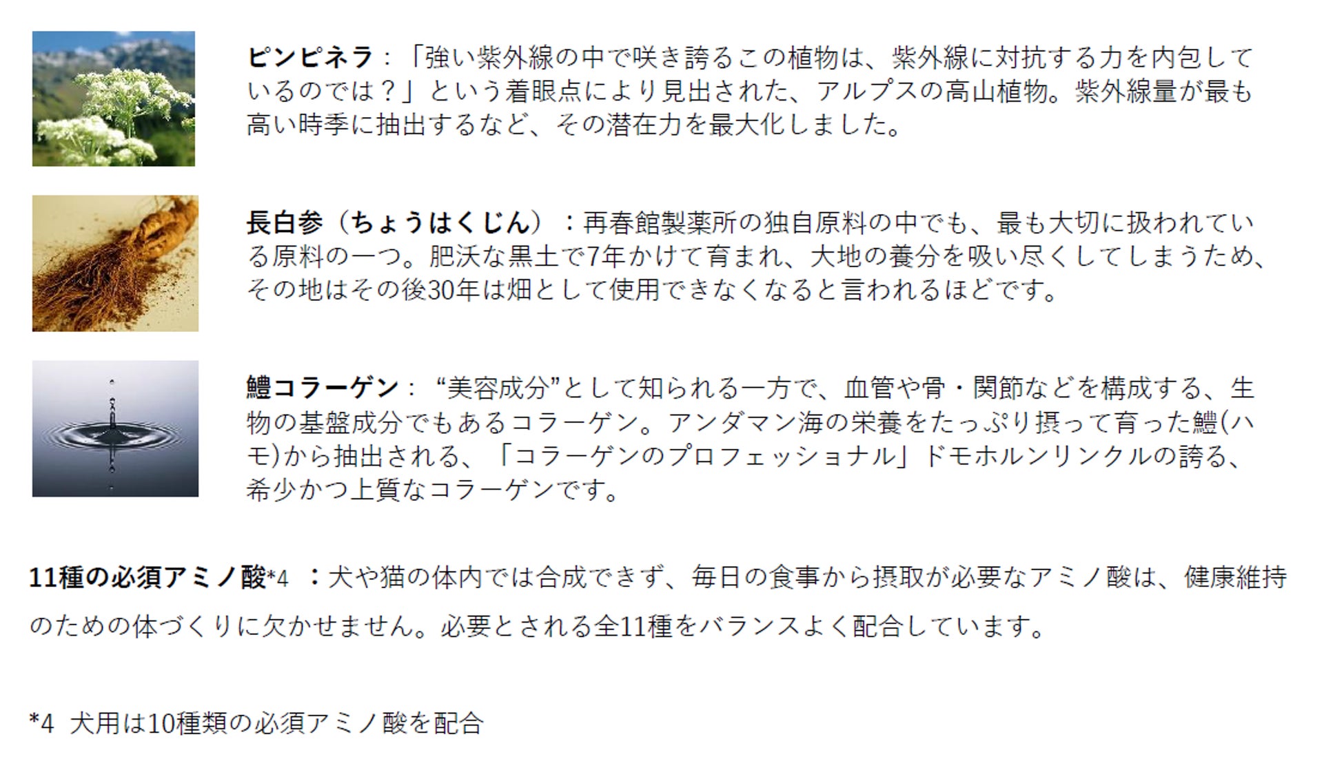 内容量 : 5g × 30本 価 格 : 単品価格 : 5,258円(税込) 定期便価格 : 4,158円(税込) シニア世代の犬猫が継続して取り入れやすい、ピューレ状のサプリメント。犬猫生活でも人気が高い「国産鶏肉」「国産鰹節」などの食材を使用したピューレをベースに、基礎化粧品や健康食品を手がける再春館製薬所の知見を活かし、特にシニア犬猫の健康維持に適した天然植物由来の独自成分「ピンピネラ」「長白参」「鱧コラーゲン」を配合しています。さらに、犬猫の健康維持に欠かせない「必須アミノ酸」を11種類 配合することで、シニア犬猫の健康ライフをサポートします。 ・商品販売ページ(犬用)