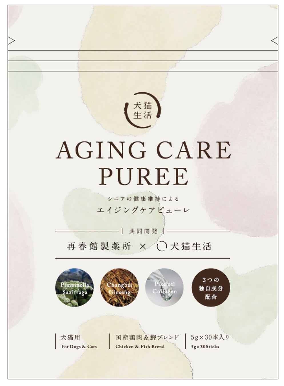 現在、日本の犬猫の平均寿命は延びており*2、ペットとして飼われている犬のうち55.5%、猫のうち46.9%は、7歳以上の高齢犬猫といわれ、シニア犬猫の健康ケアニーズはますます高まると考えられています。ペットの高齢化が加速する背景を受け、犬猫生活社は、国産・無添加のプレミアムペットフードを累計2,500万食*3販売している同社のノウハウに、再春館製薬所が長年培ってきた原料や技術の知見を掛け合わせることでの、ペットの健康ライフのサポートを企画。再春館製薬所もその想いに深く共感し、このたびの協業に至りました。