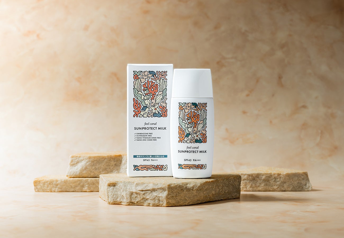 『feel coral サンプロテクト ミルク』は、サンゴに悪影響を与える可能性のある原料を使わず処方された日焼け止めです。パッケージにもこだわり、容器にはバイト樹脂を採用、糸川優さんの素敵なイラストをほどこした外箱は、、サトウキビの搾りカスを原料にしたバガス紙仕様で、すべてが環境に配慮したもので構成された商品です。