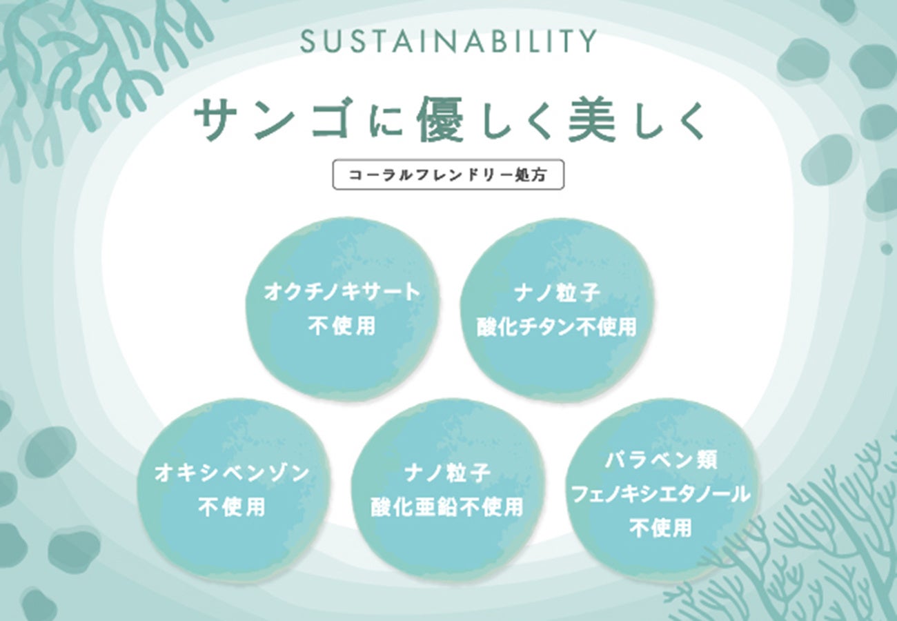 サンゴに害のある原料を使用していない日焼け止めとして、欧米や太平洋諸国で規制されている成分(オキシベンゾン、オクチノキサート、パラベン類、フェノキシエタノールや、同じ日焼け止め剤であってもナノ化した酸化亜鉛や、ナノ化酸化チタンを不使用とし、鉱物油、アルコール、防腐剤、香料も不使用です。