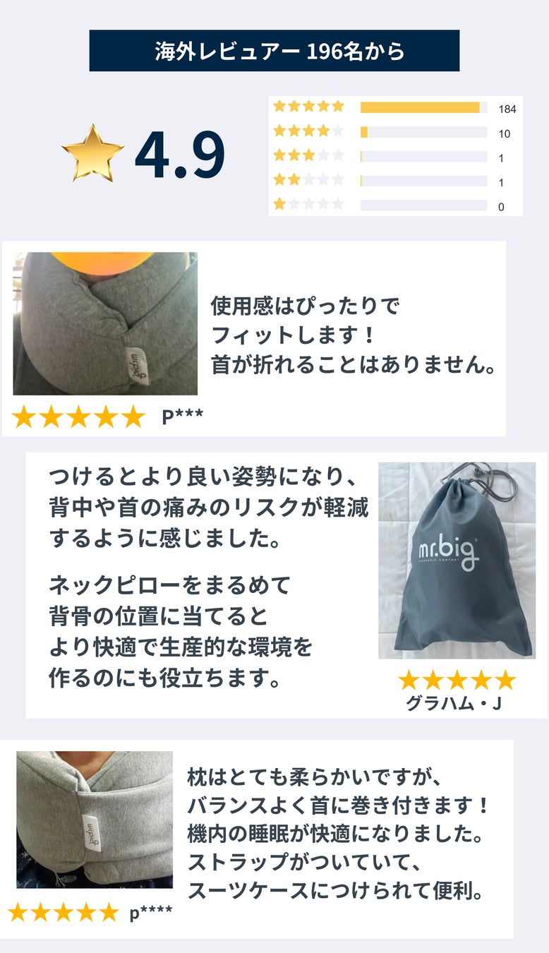 海外の先行レビュアーの間でもデザイン性や着用した感想でたくさんの評価をいただいています。mr.bigは移動時間をしっかり休息の時間へ変え、快眠の「正解」となるネックピローです。