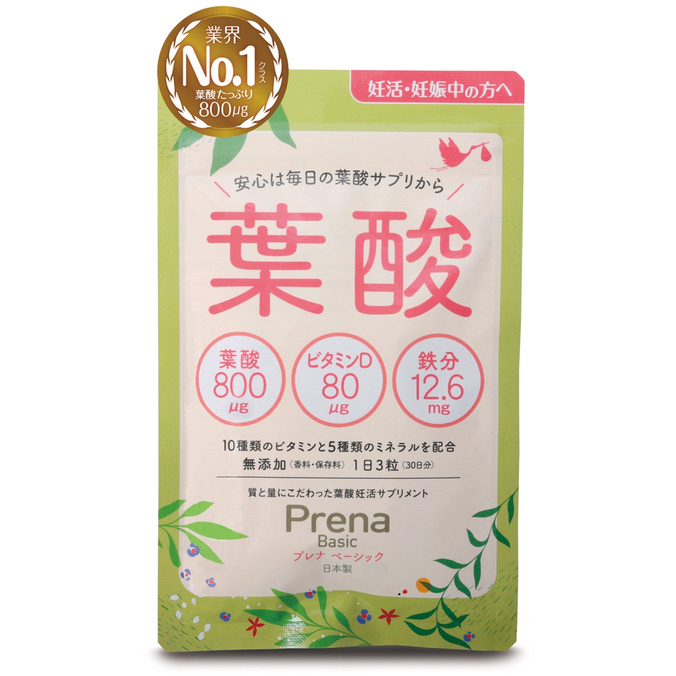「プレナ ベーシック」最大のこだわりは、葉酸の含有量です。受胎前後に葉酸のサプリメントを投与することによって胎児の神経管閉鎖障害のリスクが低減することは数多くの介入試験で明らかにされています。厚生労働省が妊活中の女性にサプリメントからの摂取を推奨している(※1)葉酸400μgの倍量の800μgは業界No.1クラスを誇ります。妊活・妊娠中に欠かすことのできない葉酸のメリットをいち早く感じられるよう、「プレナ ベーシック」には食品から摂取できる「ポリグルタミン酸型葉酸」ではなく、吸収の早い「モノグルタミン酸型葉酸」をたっぷり800μg配合することで、質と量の両方をカバーすることを実現いたしました。