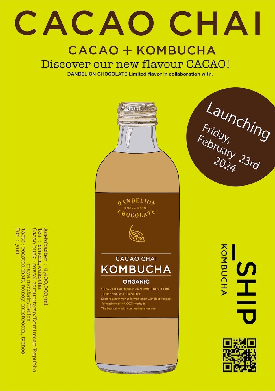 _SHIP KOMBUCHAブルワーが海外で偶然出会ったカカオジュースの記憶や、その後ご縁があり、Bean to Bar チョコレート専門店「ダンデライオン・チョコレート ファクトリー&カフェ蔵前店」で知ったカカオ豆の個性的な酸味の魅力にインスパイアされた限定フレーバーです。