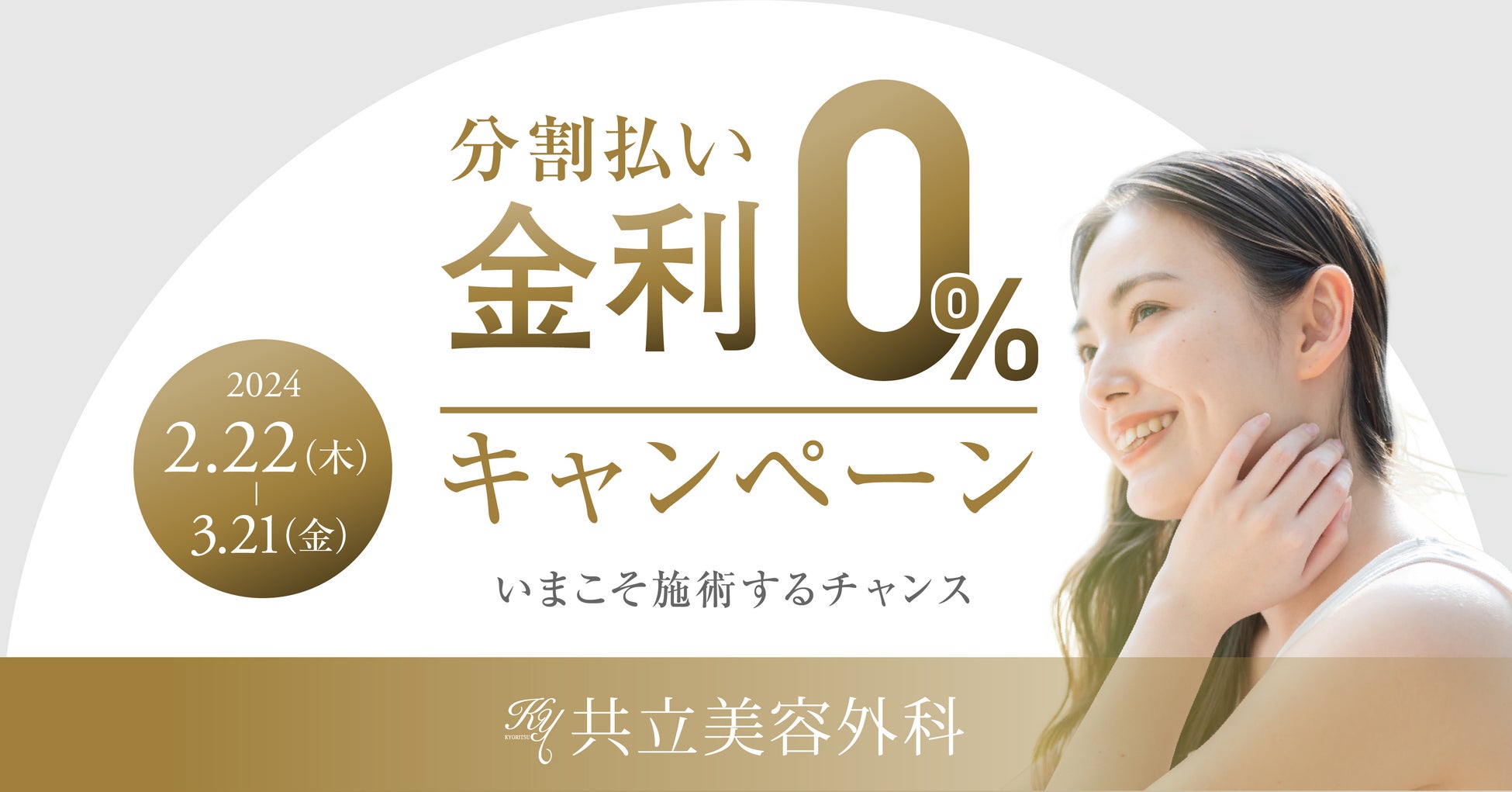 全国主要都市に展開する美容クリニック「共立美容外科」(運営:医療法人社団美人会、本社:東京都渋谷区、理事長:久次米秋人)は、本日2024年2月22日(木)から3月21日(金)の期間限定で分割払い金利0%キャンペーン実施いたします。「施術をやりたかったけどローンの金利が気になって踏み出せなかった」という方にとって、絶好の機会を提供するため、共立美容外科が分割金利を負担いたします。