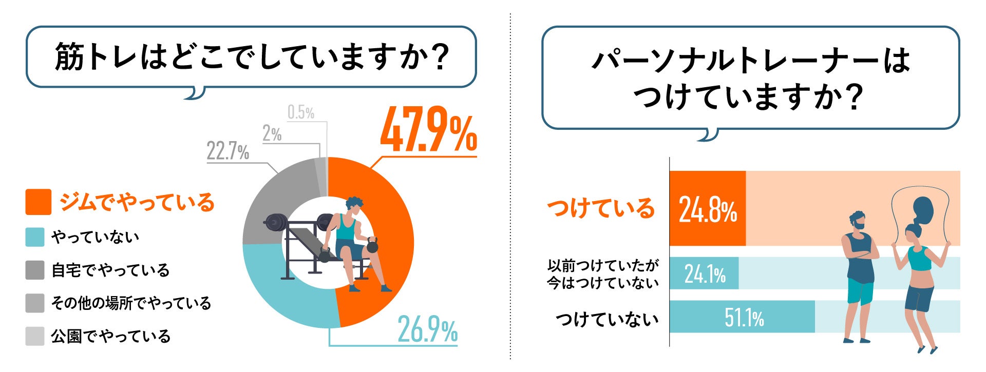 また、パーソナルトレーナーをつけているかの質問に関しては、24.8%がつけていると回答。4人に1人がパーソナルトレーニングを行っているという結果になりました。