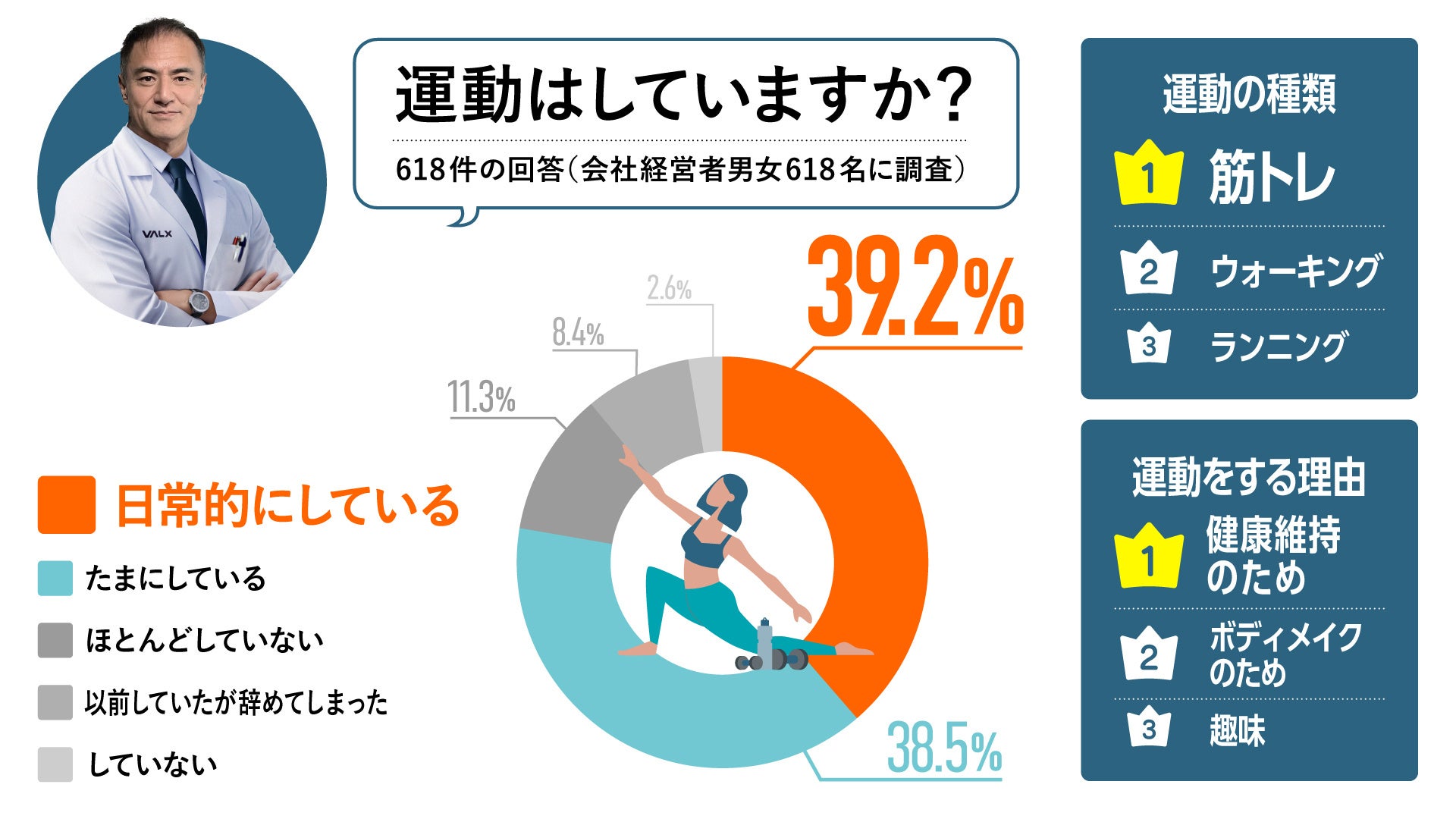 運動を日常的にしている割合は39.2%、たまにしている割合は38.5%という調査結果が出ました。