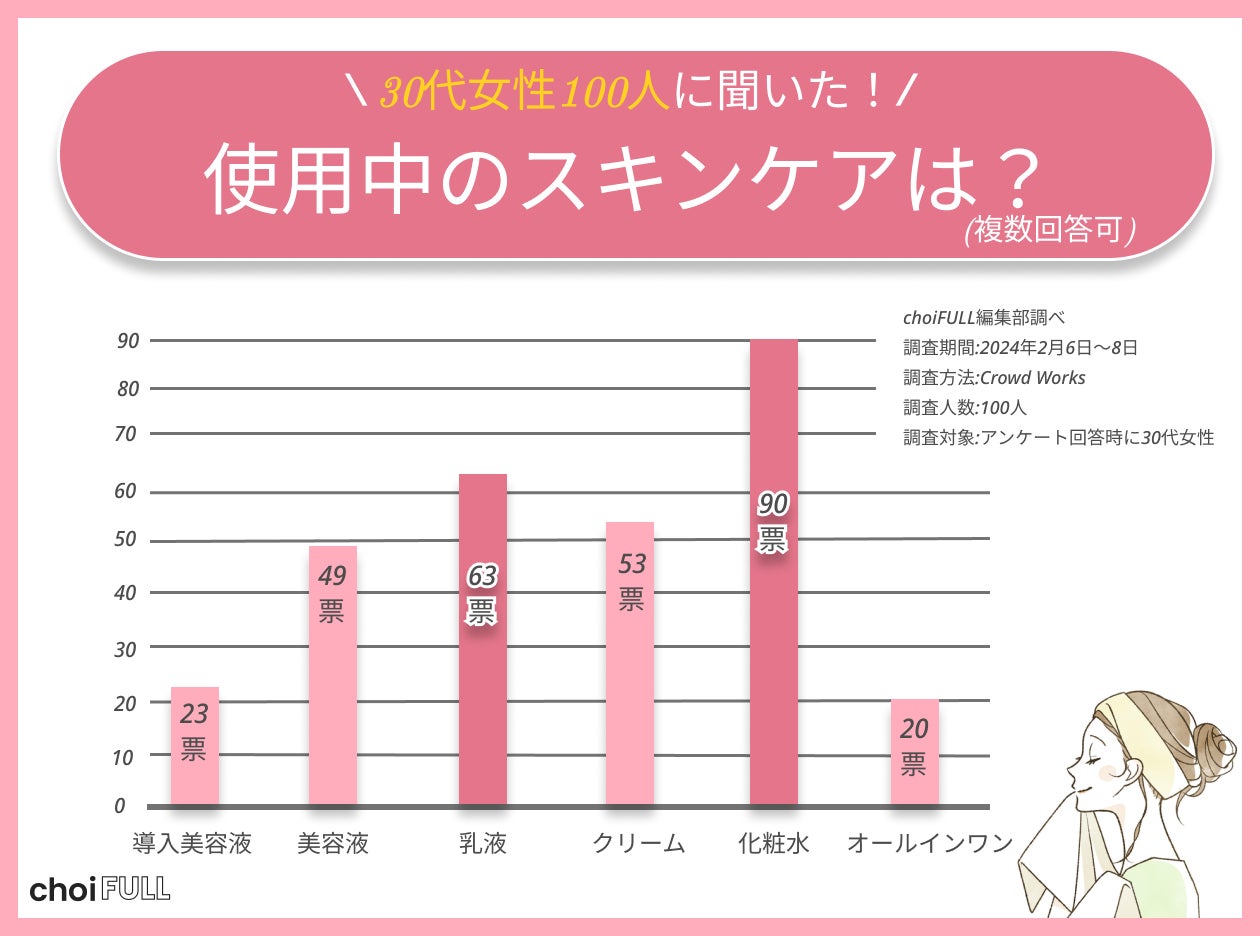 30代女性100人に使用中のスキンケアを聞いたところ、9割が化粧水を使用する結果に。また、美容液とクリームの使用率は約5割の人が使っていました。