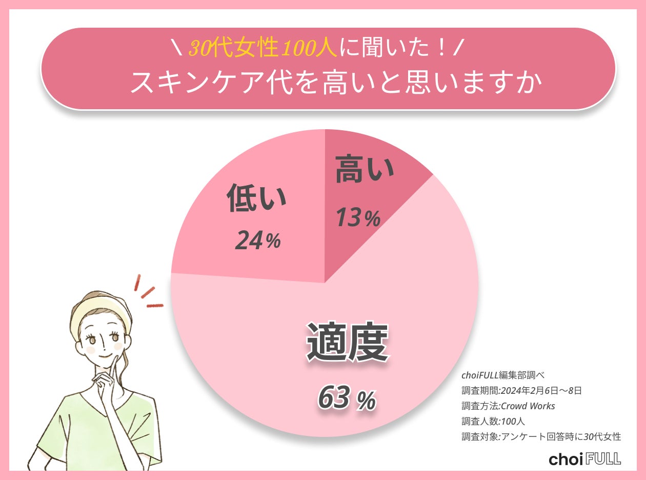 「スキンケア代を高いと思いますか?」という質問に対して、30代女性のうち6割以上が「適度」と回答。それには以下の理由が挙げられます。