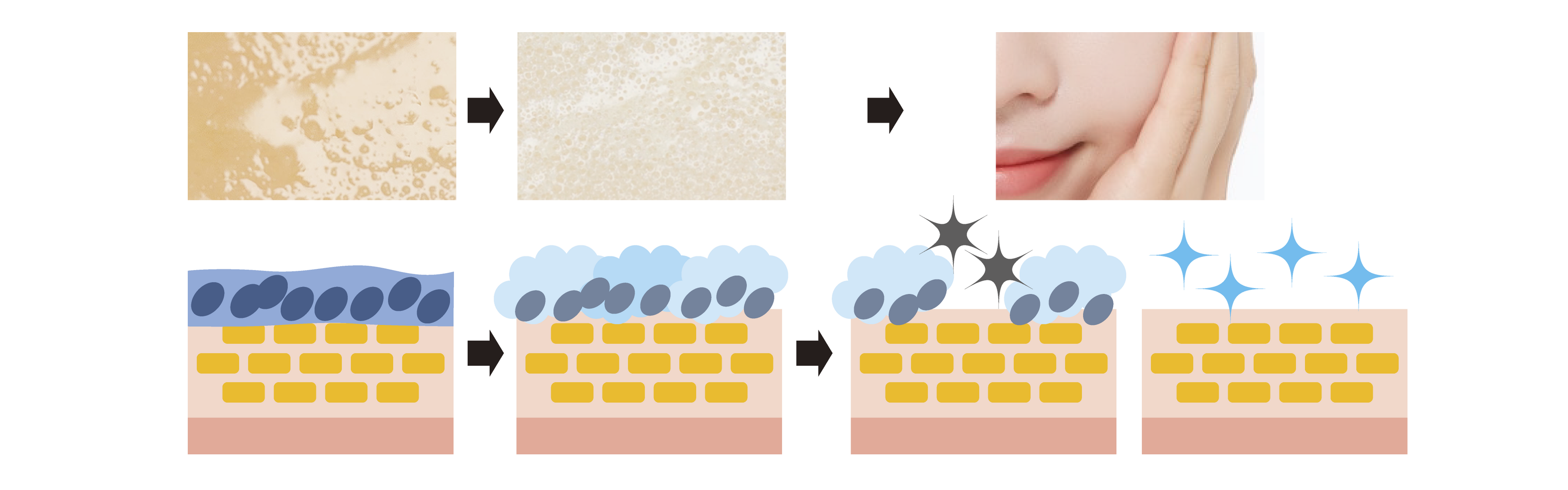 水分たっぷりのジェル状洗顔料が肌の上でじわじわと自然に発泡。フッ素系成分*²により発泡した泡が古い角質や老廃物をふやかし毛穴汚れをスッキリ落とします。