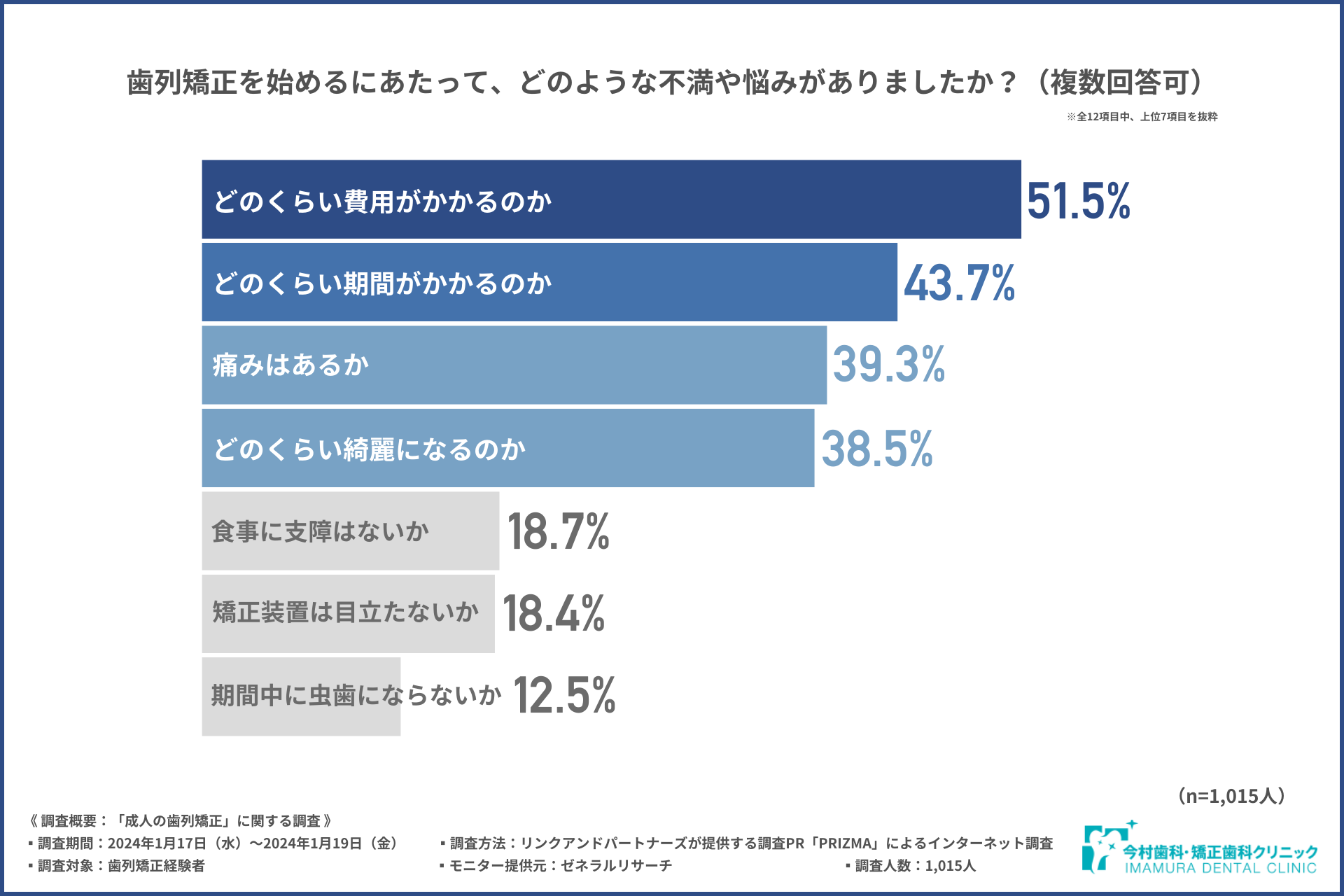 また、「歯列矯正を始めるにあたって、どのような不満や悩みがありましたか?(複数回答可)」と質問したところ、『どのくらい費用がかかるのか(51.5%)』と回答した方が最も多く、次いで『どのくらい期間がかかるのか(43.7%)』『痛みはあるか(39.3%)』『どのくらい綺麗になるのか(38.5%)』と続きました。
