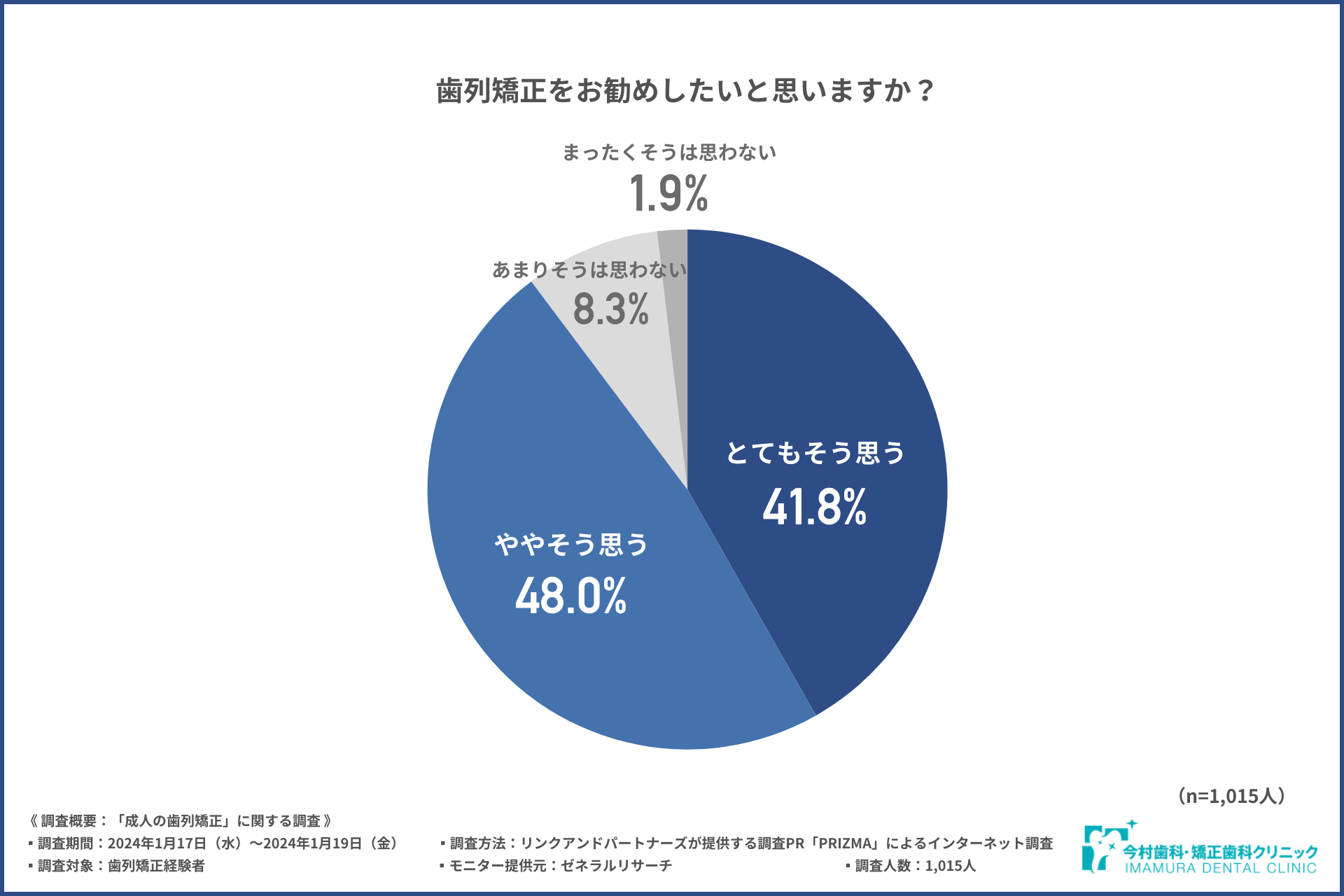 最後に「歯列矯正をお勧めしたいと思いますか?」と質問したところ、『とてもそう思う(41.8%)』『ややそう思う(48.0%)』『あまりそうは思わない(8.3%)』『まったくそうは思わない(1.9%)』と続きました。