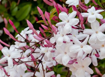 内側が白く、外側が薄紅色の花をたくさんつけ、花が咲くと甘く柔らかな香りが辺りに漂う。