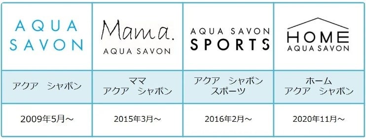 性別や年齢を問わず、爽やかで清潔感のある香りを好む方にお使いいただける「アクア シャボン」、子どもを持つママ向けの「ママ アクア シャボン」、あらゆるアクティブシーンにフィットする「アクア シャボン スポーツ」、おうちで愉しむ香りを提案する「ホーム アクア シャボン」があります。