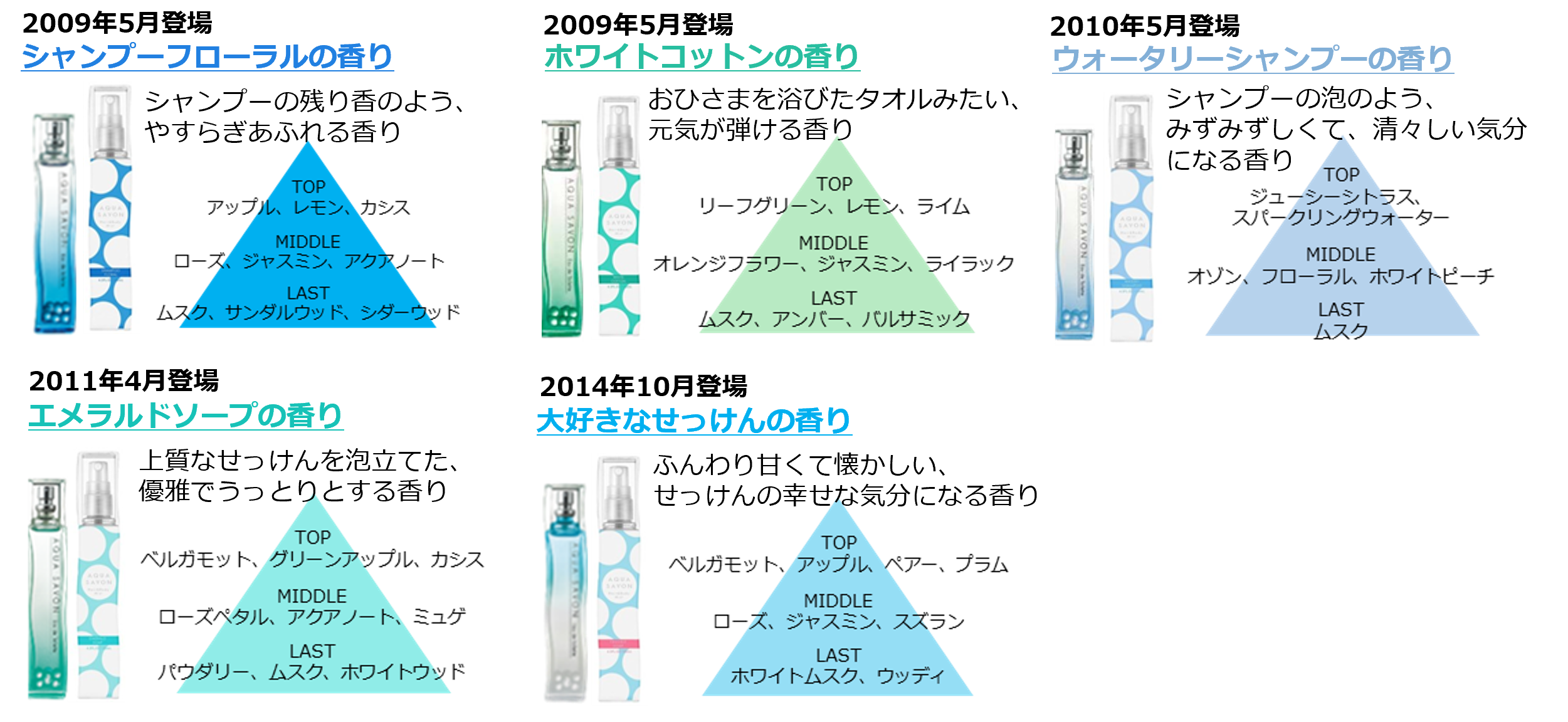 2009年5月に「オードトワレ」2種を発売以来、誰からも愛される“泡(シャボン)の香り”が、軽い香りを好む日本人に支持され続けるロングセラーブランドです。