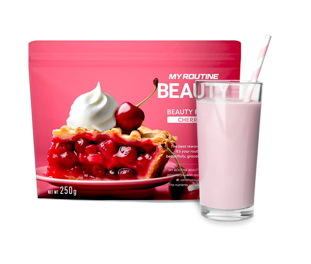 マイルーティーンBEAUTY“チェリーパイ風味”は、近年のレトロブームから“アメリカンレトロ”の流行に注目し誕生しました。アメリカの代表的なスイーツである「チェリーパイ」の風味をイメージし、オーブンから出した焼きたてのチェリーパイを再現。パイ生地の香ばしいバターの香りとサワーチェリーの爽やかな甘味と酸味が絶妙にマッチする風味豊かな味わいです。ミルクで割るとアイスクリームを乗せたチェリーパイのような味わいで、水で割るとスッキリとしたベリー系のドリンクとしてもお楽しみいただけます。