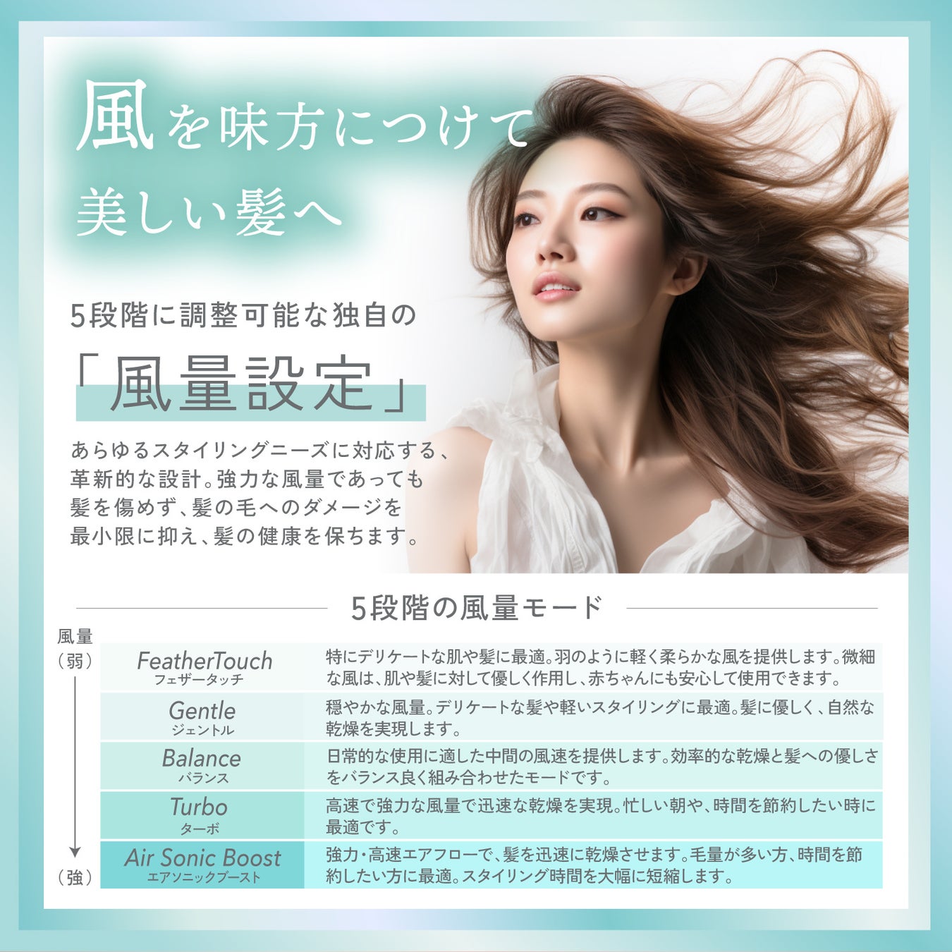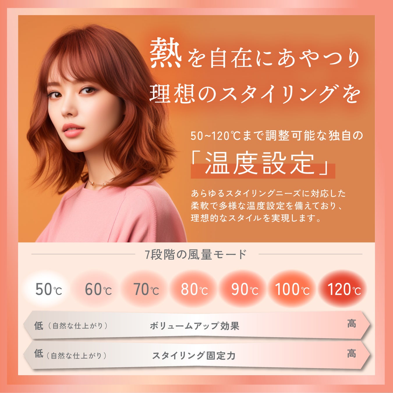 風量は5段階に調節でき、髪の毛を乾かすだけでなくスタイリング時も最適な風量でご使用いただけます。