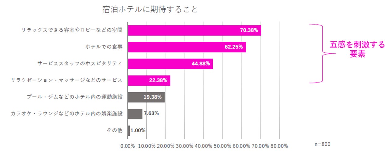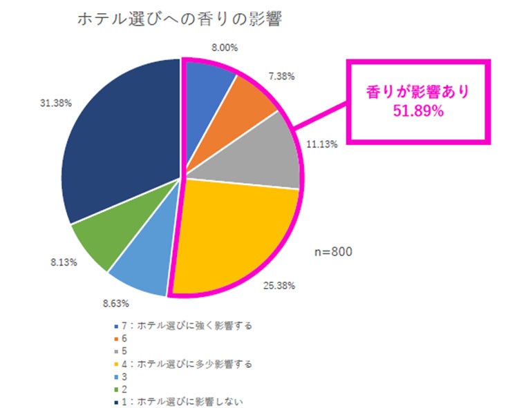 セントマティックの実施したインターネット調査によると、宿泊ホテルに対して、五感を刺激する要素を求めているという調査結果がでました。合わせて、ホテル選び自体に香りが影響していると約半数(51.89%)が回答をしています。