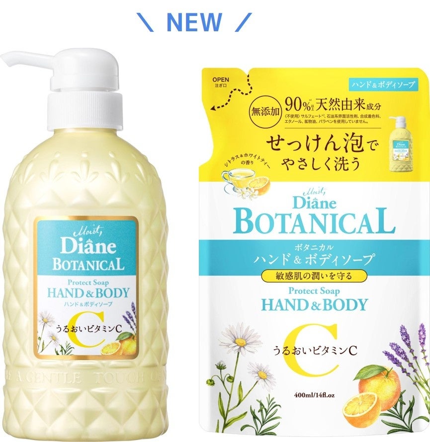 今回発売するのは、嬉しいビタミンC※2を配合したハンド&ボディソープ。ダイアンボタニカルがこだわる成分はそのままに、パインセラミド※4を配合し、空調や紫外線による乾燥などから肌のうるおいを守ります。暑くなるこれからの季節にぴったりのさわやかなシトラス&ホワイトティーの香りで気分もリフレッシュ。透明感のあるみずみずしい肌を保ちます。