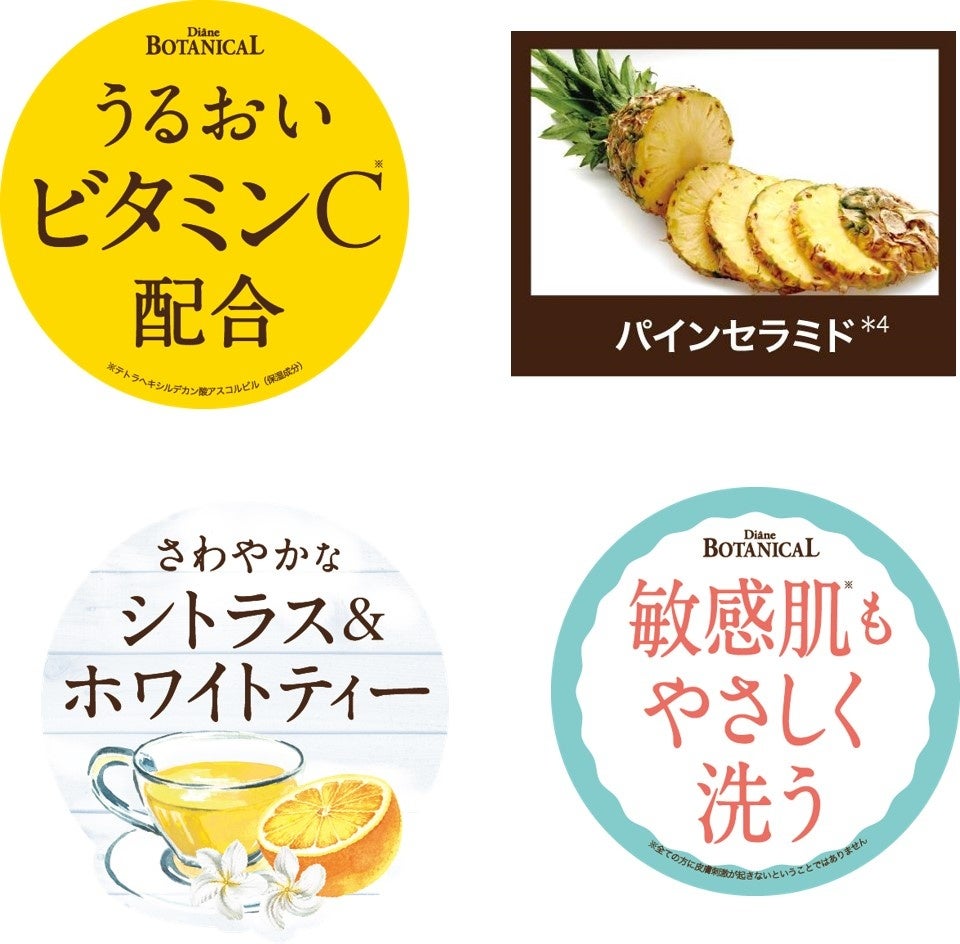 今回発売するのは、嬉しいビタミンC※2を配合したハンド&ボディソープ。ダイアンボタニカルがこだわる成分はそのままに、パインセラミド※4を配合し、空調や紫外線による乾燥などから肌のうるおいを守ります。暑くなるこれからの季節にぴったりのさわやかなシトラス&ホワイトティーの香りで気分もリフレッシュ。透明感のあるみずみずしい肌を保ちます。