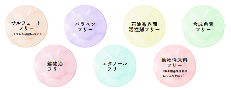 ※3 サルフェートフリー(ラウレス硫酸Naなど)、パラベンフリー、合成色素フリー、鉱物油フリー、石油系界面活性剤フリー、エタノールフリー、動物性原料(微生物由来、はちみつ除く)フリー