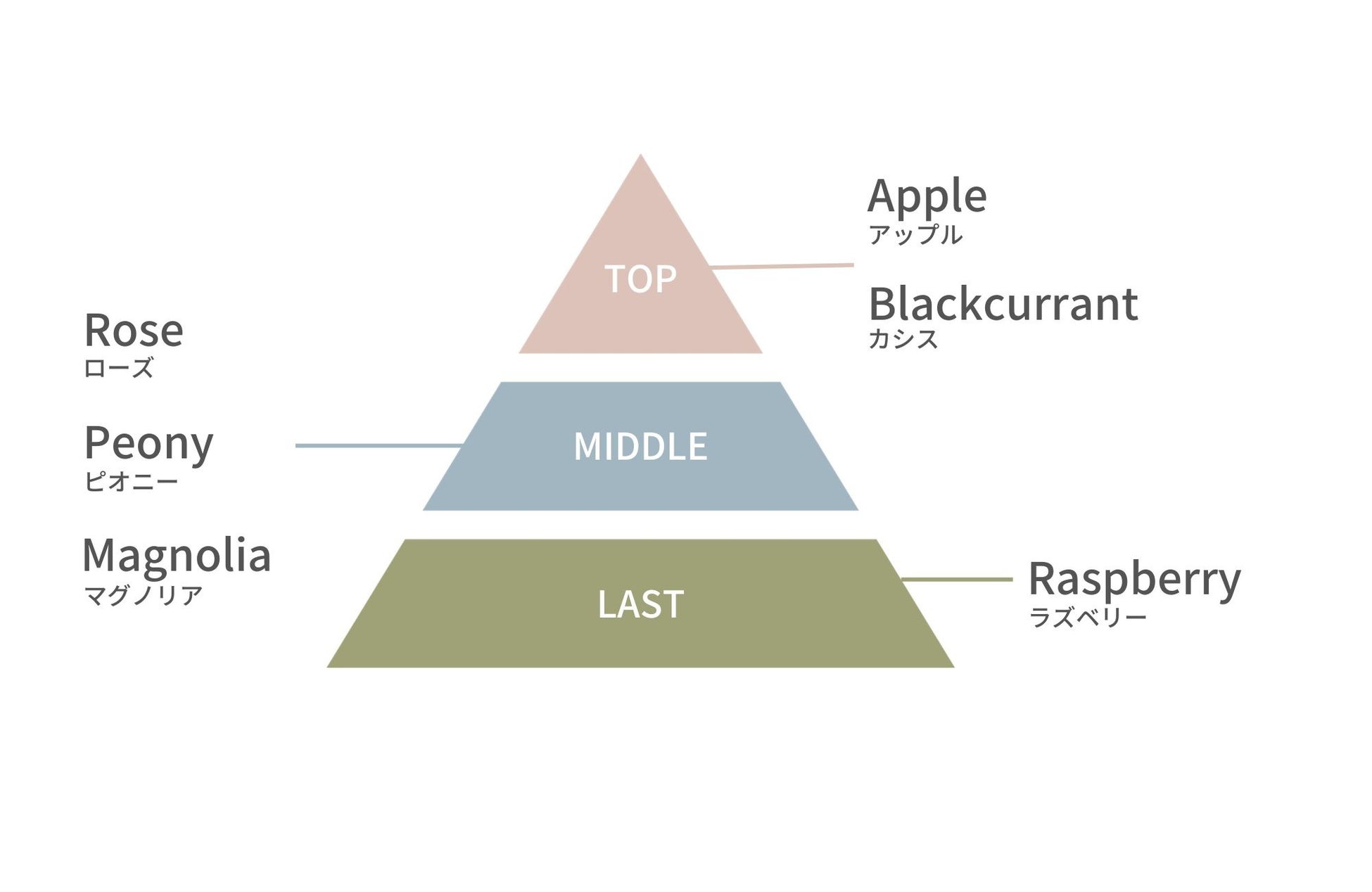 ピオニーやマグノリア、ローズなど花々や、アップル、ラズベリーなどの果物のみずみずしく、ほのかに甘く優しいフローラルドロップスの香り。