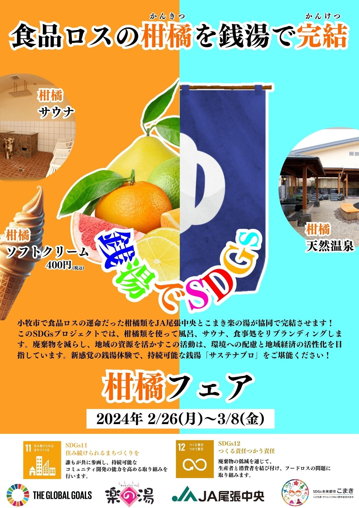 2024年2月26日~3月8日限定で、愛知県小牧市の天然温泉こまき楽の湯とJA尾張中央(愛知県小牧市、春日井市、豊山町)が協力し、「サステナブロ」というコンセプトのもと、持続可能な地域社会の実現に向けた新たな取り組みを行います。このユニークなプロジェクトでは、小牧市で食品ロスになる恐れがある柑橘(みかん、甘夏、不知火、レモン、はるみ)を救い出し、銭湯施設の風呂、サウナ、食事処で「食品ロスの柑橘を銭湯で完結」させることを目指します。SDGsの理念に基づき、廃棄物の削減と地域資源の有効活用を追求することで、環境保護と地域経済の活性化に貢献します。