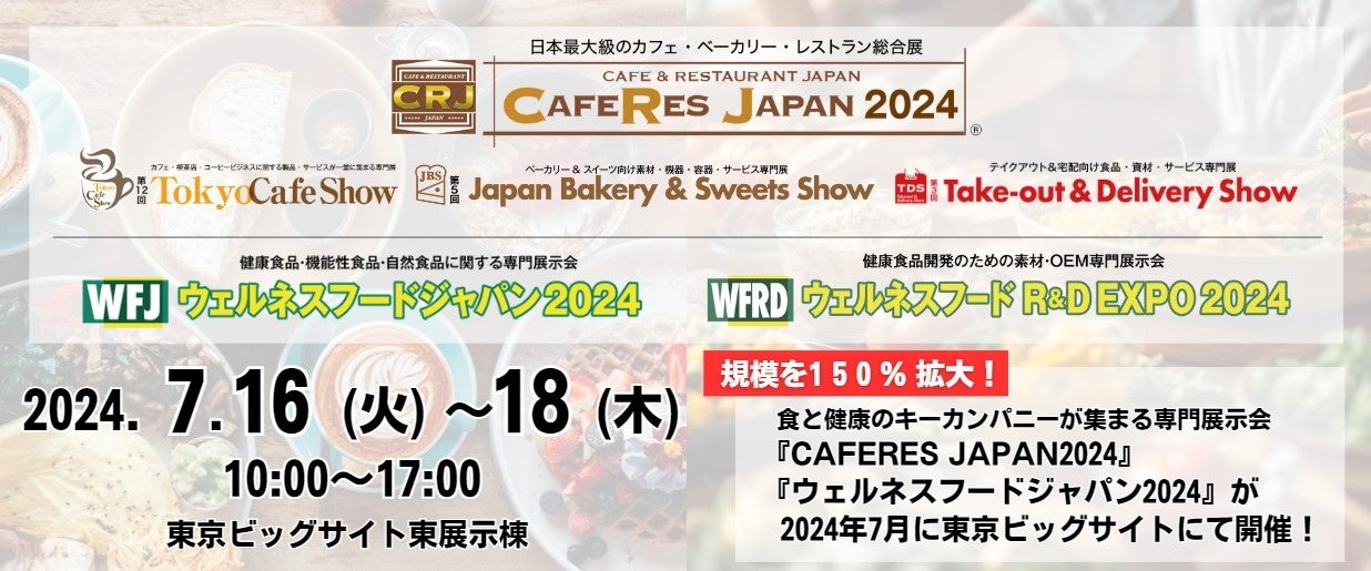 【規模を150%拡大!】食と健康のキーカンパニーが集まる専門展示会   『CAFERES JAPAN2024』『ウェルネスフードジャパン2024』が2024年7月に     東京ビッグサイトにて開催!
