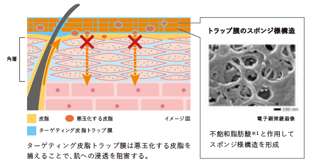 すべての皮脂を吸着し減らすのではなく、皮脂成分のうち「悪玉化する皮脂(不飽和脂肪酸*)」を速く、持続的にトラップする新技術。トラップ膜は不飽和脂肪酸と作用するとスポンジ様構造を形成。その運動性を抑え、肌への浸透を阻害します。