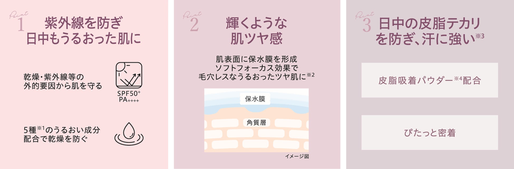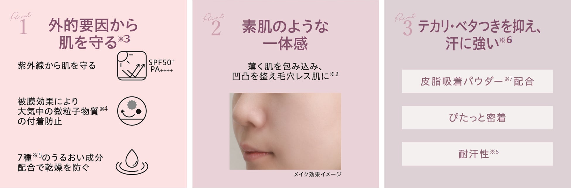 ※1被膜効果によりちり、ほこり・ PM2.5の肌への付着を防ぎ紫外線を防ぐこと※2メイクアップ効果による※3被膜効果によりほこり、PM2.5の肌への付着を防ぎながら紫外線を防ぐこと※4ほこり、PM2.5※5植物性スクワラン ・ オリブ油 ・ ホホバ油 ・ マカデミアナッツ油 ・ ローズヒップ油 ・ ヒアルロン酸ナトリウム(2) ・ アンズ果汁※6メイクアップの耐久性のこと※7ヒドロキシアパタイト (粉体基剤)