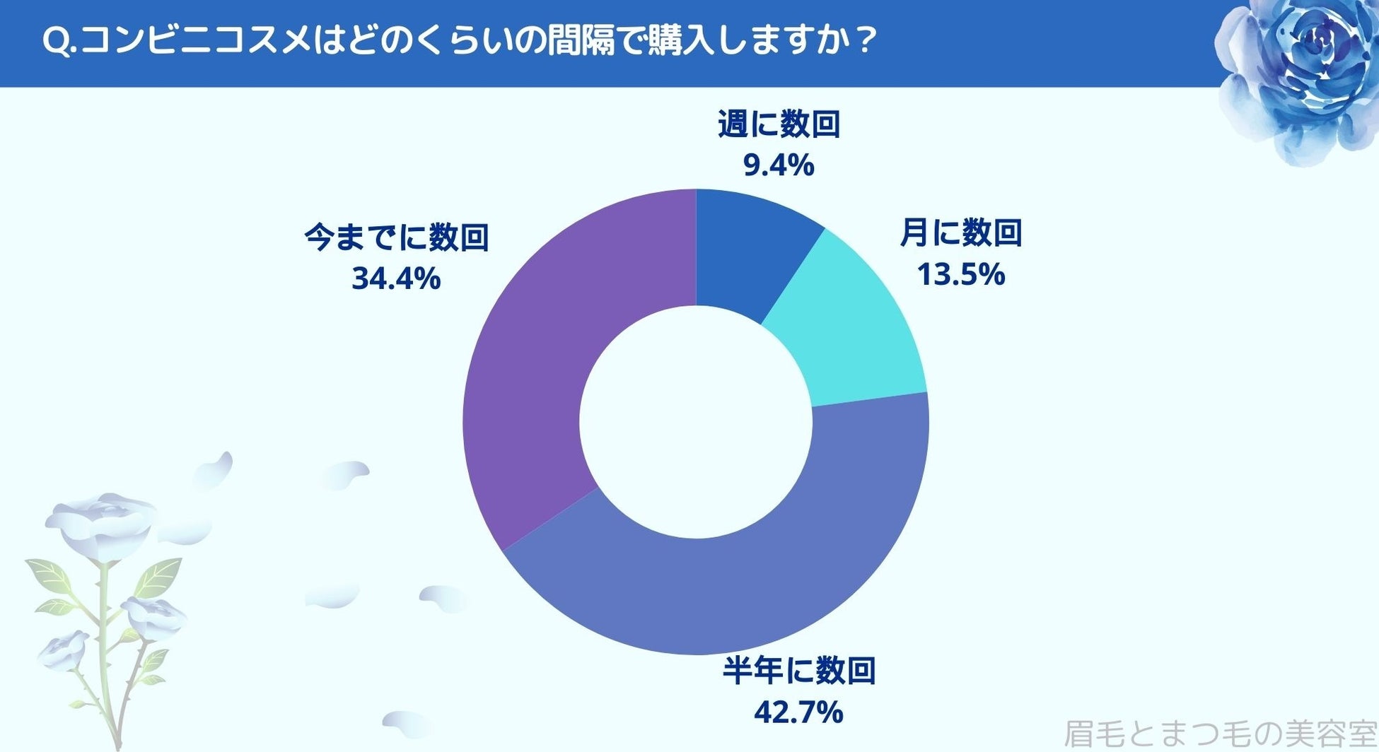 コンビニコスメをどのくらいの間隔で購入しているかお聞きしたところ「週に数回(9.4%)」、「月に数回(13.5%)」、「半年に数回(42.7%)」、「今までに数回(34.4%)」という結果になりました。