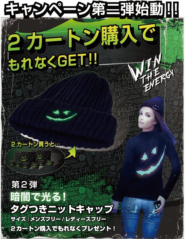 公式サイト(https://the3rdfree.com/hunterenergy/)にてHUNTER ENERGYを2カートン購入すると、もれなく全員に限定ニットキャップをプレゼント!
