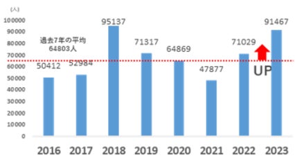 昨年の夏は、熱中症で救急搬送された人数は過去6年と比較して2番目に多い結果となりました。消防庁が発表した「令和5年(5月から9月)の熱中症による救急搬送状況」によると、過去7年の平均の約1.4倍、9万人以上の方が熱中症で救急搬送されたことが明らかになりました。この暑さはラニーニャ現象によるものとされていますが、この影響は少なくとも24年春までは続くとみられており、今年も平均最高気温を更新する可能性があります。