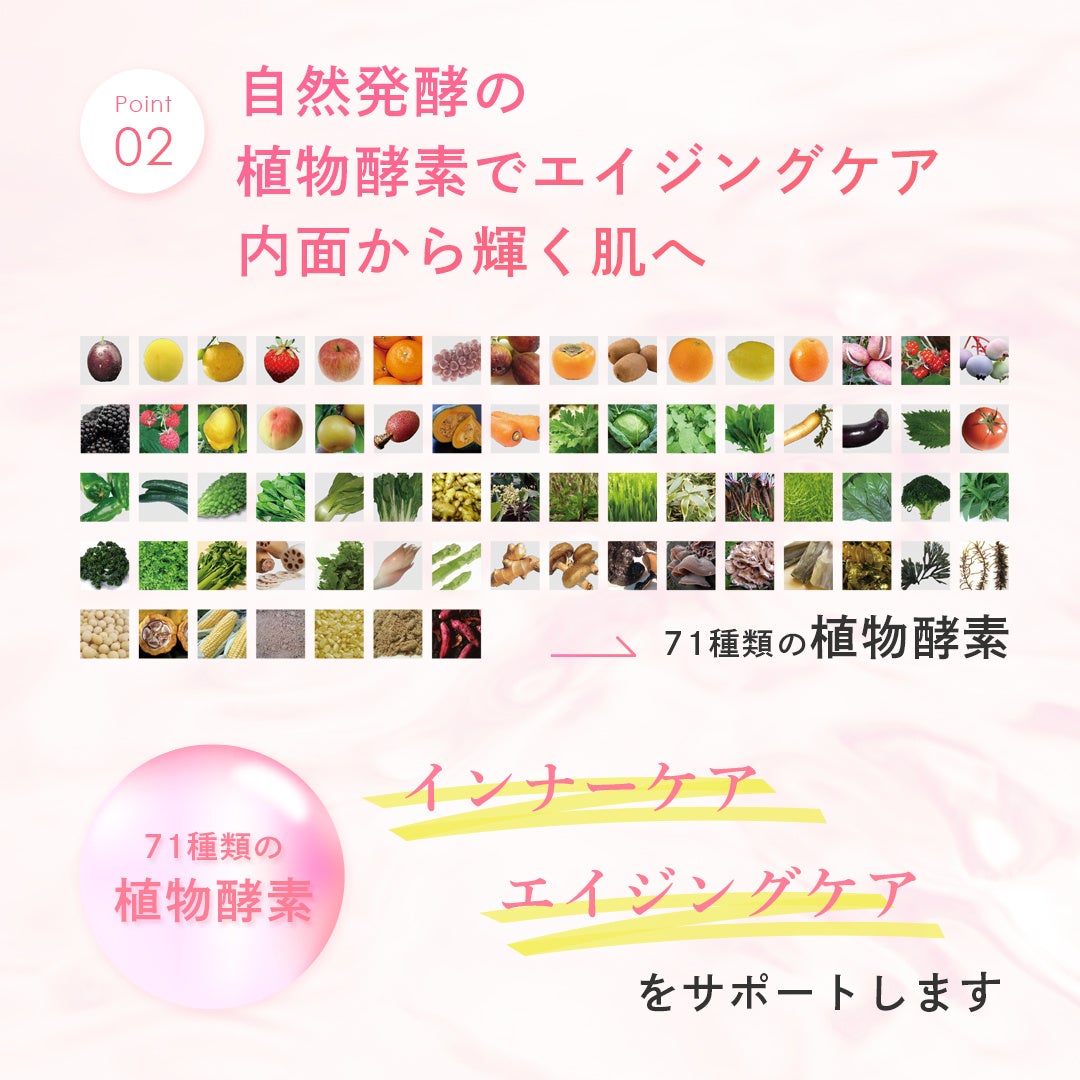 厳選された美容成分: 71種類の野草、野菜、果物、穀物、茸、海藻を熟成・発酵させた岡山県・賀陽の植物酵素、β-NMN、システインペプチド、乳酸菌 EC-12、ツバメの巣、コラーゲン、ヒアルロン酸、プロテオグリカンを高濃度で配合。