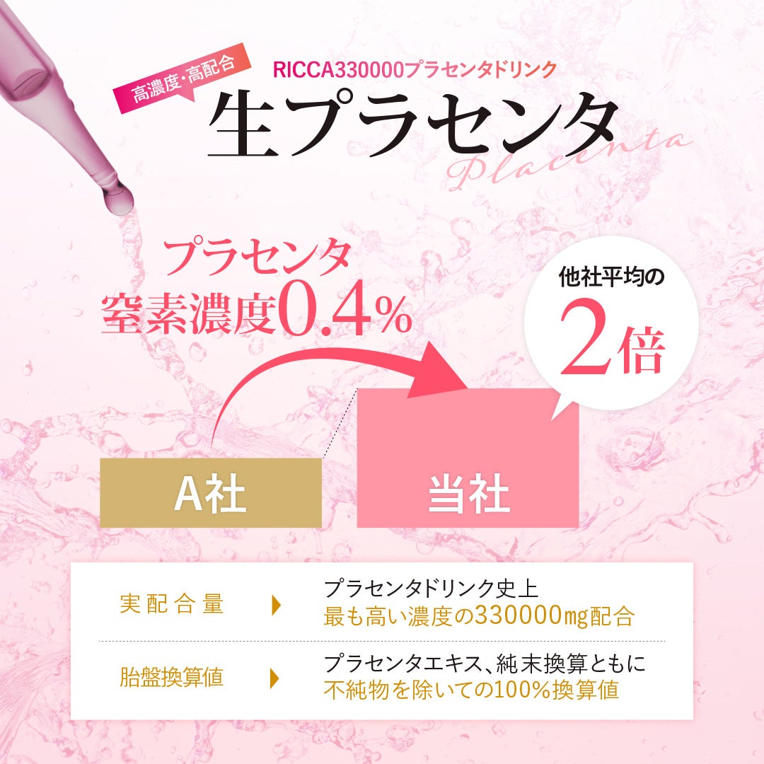 高濃度の生プラセンタエキス配合: ボトル容量500mLに対して330,000mgのプラセンタエキスを配合。(1回15mLでプラセンタ注射約5本分の9,900mgのプラセンタエキスを配合)当社独自の製法により、有効成分を保ちつつ原料臭の低減に成功。